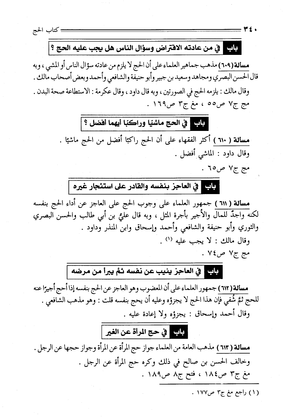 مسألة (609) مذهب جماهير العلماء على أن الحج لا يلزم من عادته سؤال الناس أو المشي، وبه قال الحسن البصري ومجاهد وسعيد بن جبير وأبو حنيفة والشافعى وأحمد وبعض أصحاب مالك.