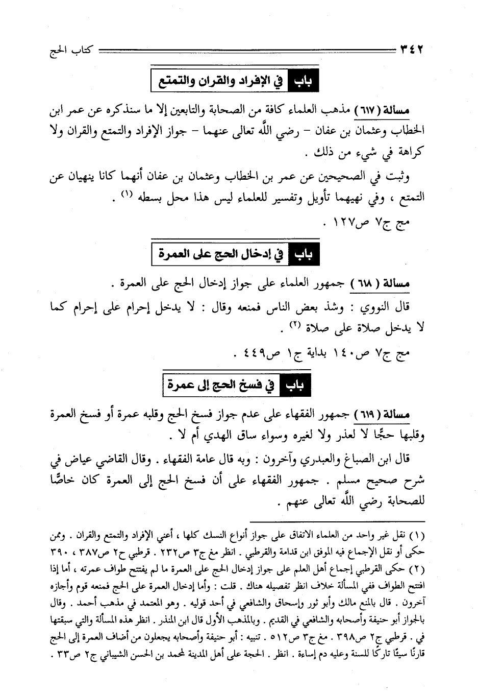 مسألة (617) مذهب العلماء كافة من الصحابة والتابعين إلا ما سنذكره عن عمر ابن الخطاب وعثمان بن عفان - رضي الله تعالى عنهما- جواز الإفراد والتمتع والقران ولا كراهة في شيء من ذلك.