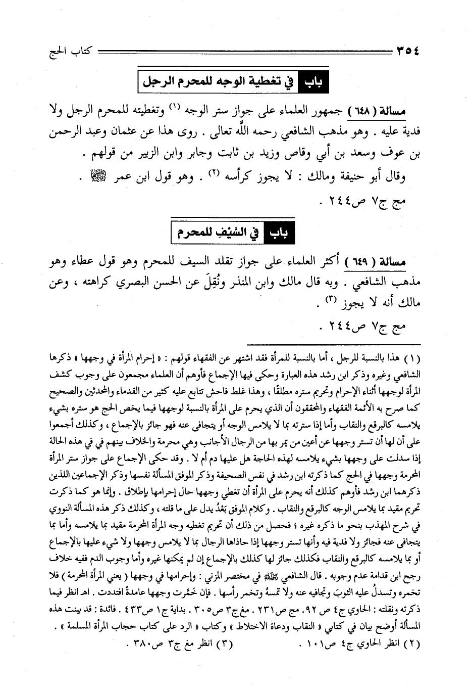 (¬1) هذا بالنسبة للرجل، أما بالنسبة للمرأة فقد اشتهر عن الفقهاء قولهم: "إحرام المرأة في وجهها" ذكرها الشافعي وغيره وذكر ابن رشد هذه العبارة وحكى فيها الإجماع فأوهم أن العلماء مجمعون على وجوب كشف المرأة لوجهها أثناء الإحرام وتحريم ستره مطلقًا، وهذا غلط فاحش تتابع عليه كثير من القدماء والمحدثين والصحيح كما صرح به الأئمة الفقهاء والمحققون أن الذي يحرم على المرأة بالنسبة لوجهها فيما يخص الحج هو ستره بشيء يلامسه كالبرقع والنقاب وأما إذا سترته بما لا يلامس الوجه أو يتجافى عنه فهو جائز بالإجماع، وكذلك أجمعوا على أن لها أن تستر وجهها عن أعين من يمر بها من الرجال الأجانب وهي محرمة والخلاف بينهم في هذه الحالة إذا سدلت على وجهها بشيء يلامسه لهذه الحاجة هل عليها دم أم لا. وقد حكى الإجماع على جواز ستر المرأة المحرمة وجهها في الحج كما ذكرته ابن رشد في نفس الصحيفة وذكر الموفق المساُلة نفسها وذكر الأجماعين اللذين ذكرهما ابن رشد فأوهم كذلك أنه يحرم على المرأة أن تغطي وجهها حال إحرامها بإطلاق. وإنما هو كما ذكرت تحريم مقيد بما يلامس الوجه كالبرقع والنقاب. وكلام الموفق بَعْدُ يدل على ما قلته، وكذلك ذكر هذه المسألة النووي في شرح المهذب بنحو ما ذكره غيره؛ فحصل من ذلك أن تحريم تغطه وجه المرأة المحرمة مقيد بما يلامسه وأما بما يتجافى عنه فجائز ولا فدية فيه وأنها تستر وجهها إذا حاذاها الرجال بما لا يلامس وجهها ولا شيء عليها بالإجماع أو بما يلامسه كالبرقع والنقاب فكذلك جائز لها كذلك بالإجماع إن لم يمكنها غيره وأما وجوب الدم ففيه خلاف رجح ابن قدامة عدم وجوبه. قال الشافعي -رحمه الله- في مختصر المزني: وإحرامها في وجهها (يعني المرأة المحرمة) فلا تخمره وتسدلُ عليه الثوبَ وتجافيه عنه ولا تمسهُ وتخمر رأسها. فإن خَمَّرت وجهها عامدةً افتددت. اهـ انظر فيما ذكرته ونقلته: الحاوي ج 4 ص 92. مج ص 231. مغ ج 3 ص 305. بداية ج 1 ص 433. فائدة: قد بينت هذه المسألة أوضح بيان في كتابي "النقاب ودعاة الاختلاط" وكتاب "الرد على كتاب حجاب المرأة المسلمة".