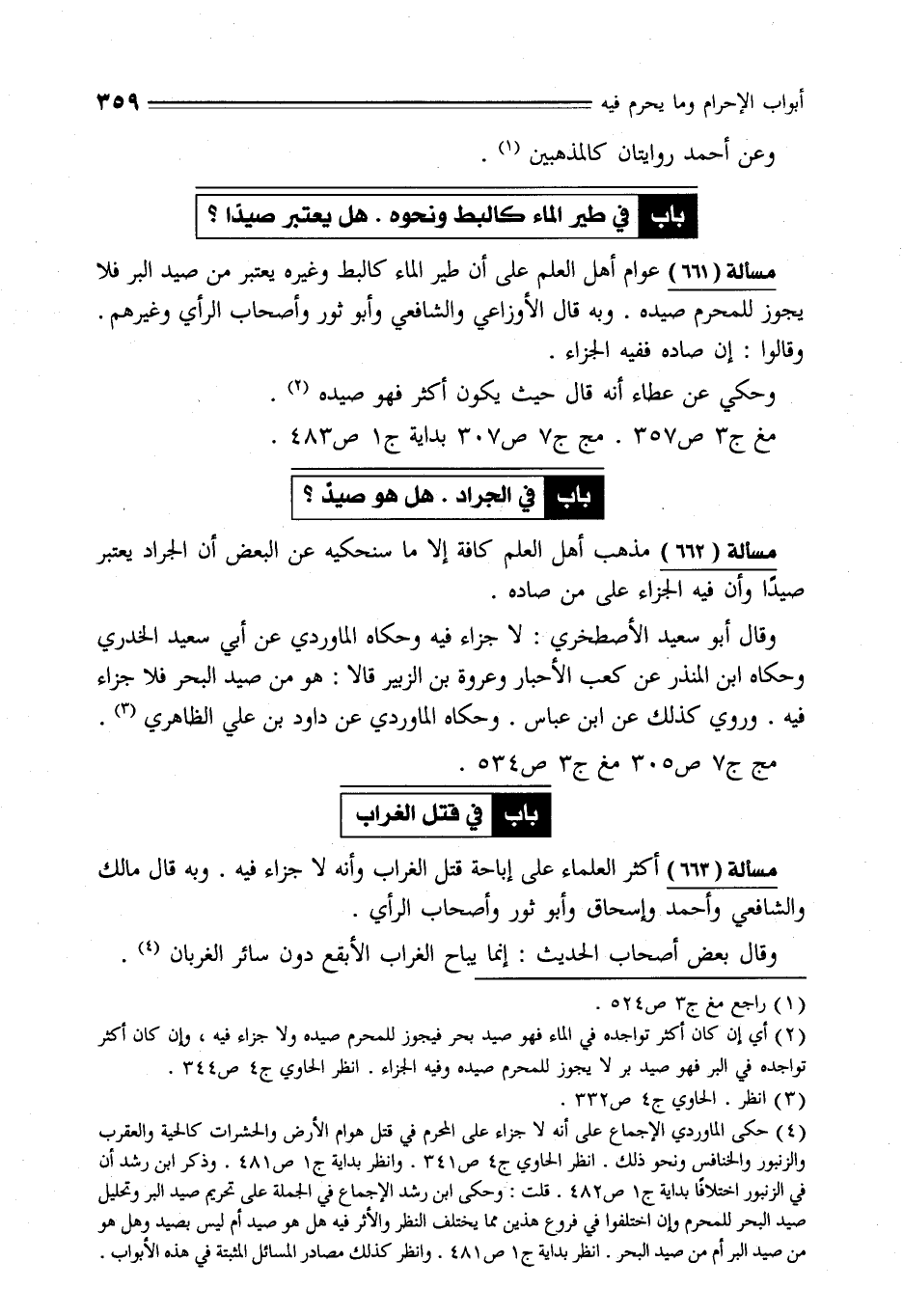 (¬4) حكى الماوردي الإجماع على أنه لا جزاء على المحرم في قتل هوام الأرض والحشرات كالحية والعقرب والزنبور والخنافس ونحو ذلك. انظر الحاوي ج 4 ص 341. وانظر بداية ج 1 ص 481. وذكر ابن رشد أن في الزنبور اختلافًا بداية ج 1 ص 482. قلت: وحكى ابن رشد الإجماع في الجملة على تحريم صيد البر وتحليل صيد البحر للمحرم وإن اختلفوا في فروع هذين مما يختلف النظر والأثر فيه هل هو صيد ثم ليس بصيد وهل هو من صيد البر ثم من صيد البحر. انظر بداية ج 1 ص 481. وانظر كذلك مصادر المسائل المثبتة في هذه الأبواب.