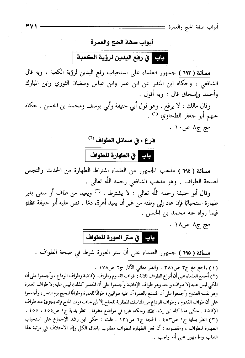 (¬3) انظر بداية ج 1 ص 453. الحجة ج 2 ص 131. قلت: حكى ابن رشد الإجماع على استحباب الطهارة للطواف، ومقصوده: أن فعل الطهارة للطواف مطوب باتفاق الكل وإنما الاختلاف في مرتبة هذا الطلب والجمهور على أنه واجب.