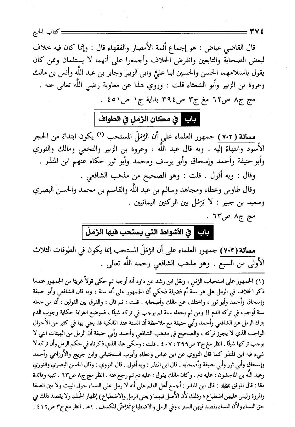 مسألة (702) جمهور العلماء على أن الرَّمَلَ المستحب (¬1) يكون ابتداءً من الحجر الأسود وانتهاءً إليه. وبه قال عبد الله، وعروة بن الزبير والنخعي ومالك والثوري وأبو حنيفة وأحمد وإسحاق وأبو يوسف ومحمد وأبو ثور حكاه عنهم ابن المنذر.