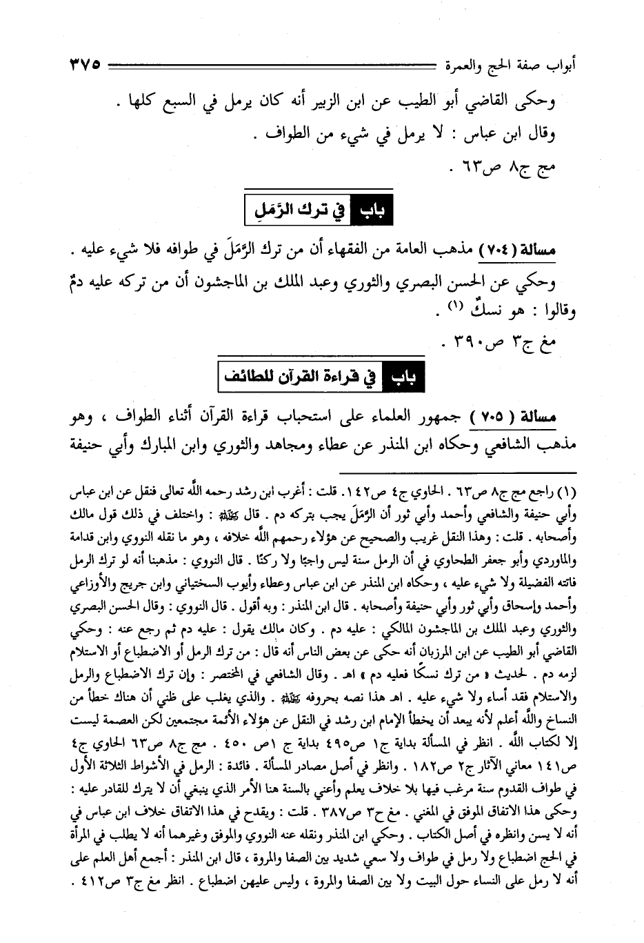 (¬1) راجع مج ج 8 ص 63. الحاوي ج 4 ص 142. قلت: أغرب ابن رشد -رحمه الله- تعالى فنقل عن ابن عباس وأبي حنيفة والشافعي وأحمد وأبي ثور أن الرَّمَلَ يجب بتركه دم. قال -رحمه الله-: واختلف في ذلك قول مالك وأصحابه. قلت: وهذا النقل غريب والصحيح عن هؤلاء رحمهم الله خلافه، وهو ما نقله النووي وابن قدامة والماوردي وأبو جعفر الطحاوي في أن الرمل سنة ليس واجبًا ولا ركنًا. قال النووي: مذهبنا أنه لو ترك الرمل فاتته الفضيلة ولا شيء عليه، وحكاه ابن المنذر عن ابن عباس وعطاء وأيوب السختياني وابن جريج والأوزاعي وأحمد وإسحاق وأبي ثور وأبي حنيفة وأصحابه. قال ابن المنذر: وبه أقول. قال النووي: وقال الحسن البصري والثوري وعبد الملك بن الماجشون المالكي: عليه دم. وكان مالك يقول: عليه دم ثم رجع عنه: وحكي القاضي أبو الطيب عن ابن المرزبان أنه حكى عن بعض الناس أنه قال: من ترك الرمل أو الاضطباع أو الاستلام لزمه دم. لحديث "من ترك نسكًا فعليه دم" اهـ. وقال الشافعي في المختصر: وإن ترك الاضطباع والرمل والاستلام فقد أساء ولا شيء عليه. اهـ هذا نصه بحروفه -رحمه الله-. والذي يغلب على ظني أن هناك خطأ من النساخ والله أعلم لأنه ييعد أن يخطأ الإمام ابن رشد في النقل عن هؤلاء الأئمة مجتمعين لكن العصمة ليست إلا لكتاب الله. انظر في المسألة بداية ج 1 ص 495 بداية ج 1 ص 450. مج ج 8 ص 63 الحاوي ج 4 ص 141 معاني الآثار ج 2 ص 182. وانظر في أصل مصادر المسألة. فائدة: الرمل في الأشواط الثلانة الأول في طواف القدوم سنة مرغب فيها بلا خلاف يسلم وأعني بالسنة هنا الأمر الذي ينبغي أن لا يترك للقادر عليه: وحكى هذا الاتفاق الموفق في المغني. مغ ح 3 ص 387. قلت: ويقدح في هذا الاتفاق خلاف ابن عباس في أنه لا يسن وانظره في أصل الكتاب. وحكي ابن المنذر ونقله عنه النووي والموفق وغيرهما أنه لا يطلب في المرأة في الحج اضطباع ولا رمل في طواف ولا سعي شديد بن الصفا والمروة، قال ابن المنذر: أجمع أهل العلم على أنه لا رمل على النساء حول البيت ولا بين الصفا والمروة، وليس عليهن اضطباع. انظر مغ ج 3 ص 412.