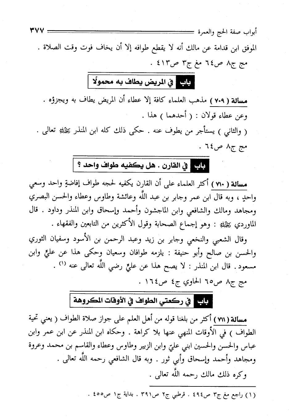 مسألة (711) أكثر من بلغنا قوله من أهل العلم على جواز صلاة الطواف (يعني تحية الطواف) في الأوقات المنهي عنها بلا كراهة. وحكاه ابن المنذر عن ابن عمر وابن عباس والحسن والحسين ابني عليّ وابن الزبير وطاوس وعطاء والقاسم بن محمَّد وعروة ومجاهد وأحمد وإسحاق وأبي ثور. وبه قال الشافعي -رحمه الله- تعالى.