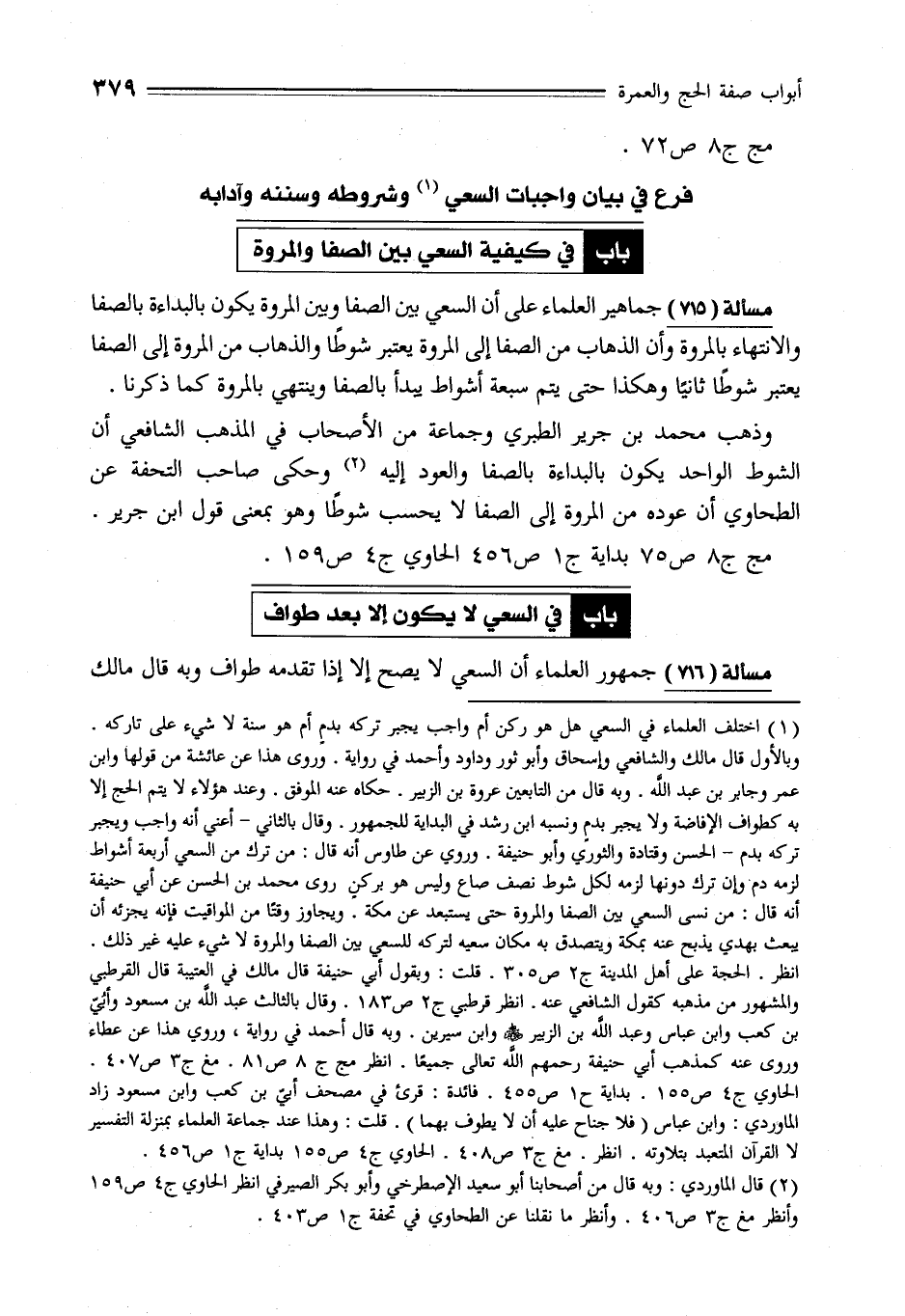 مسألة (715) جماهير العلماء على أن السعي بين الصفا وبين المروة يكون بالبداءة بالصفا والانتهاء بالمروة وأن الذهاب من الصفا إلى المروة يعتبر شوطًا والذهاب من المروة إلى الصفا يعتبر شوطًا ثانيًا وهكذا حتى يتم سبعة أشواط يبدأ بالصفا وينتهي بالمروة كما ذكرنا.