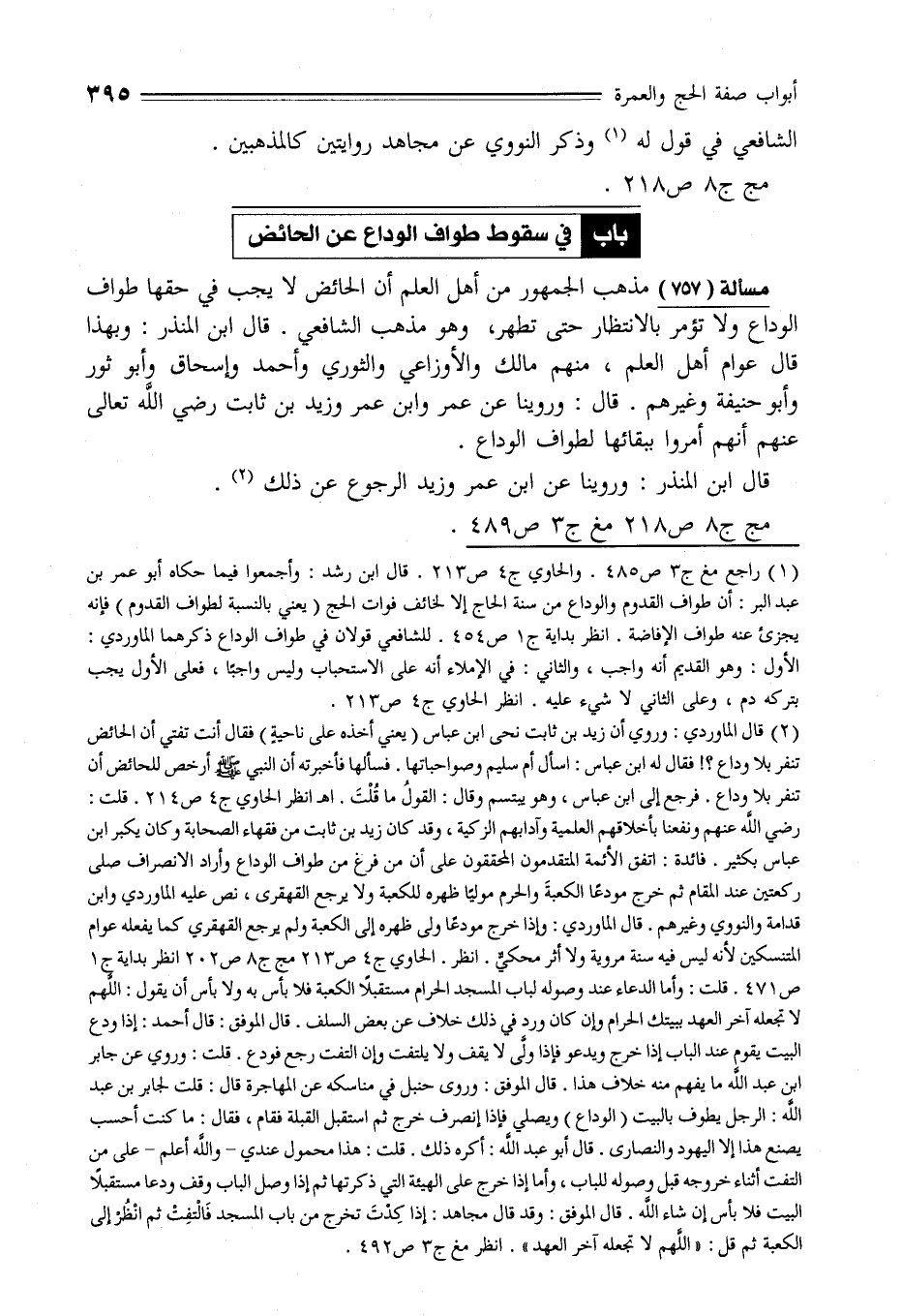 (¬2) قال الماوردي: وروي أن زيد بن ثابت نحى ابن عباس (يعني أخذه على ناحيةٍ) فقال أنت تفتي أن الحائض تنفر بلا وداع؟! فقال له ابن عباس: اسأل أم سليم وصواحباتها. فسألها فأخبرته أن النبي -صلى الله عليه وسلم - أرخص للحائض أن تنفر بلا وداع. فرجع إلى ابن عباس، وهو يبتسم وقال: القولُ ما قُلْتَ. اهـ انظر الحاوي ج 4 ص 214. قلت: رضي الله عنهم ونفعنا بأخلاقهم العلمية وآدابهم الزكية، وقد كان زيد بن ثابت من فقهاء الصحابة وكان يكبِّر ابن عباس بكثير. فائدة: اتفق الأئمة المتقدمون المحققون على أن من فرغ من طواف الوداع وأراد الانصراف صلى ركعتين عند المقام ثم خرج مودعًا الكعبةَ والحرم موليًا ظهره للكعبة ولا يرجع القهقري، نص عليه الماوردي وابن قدامة والنووي وغيرهم. قال الماوردي: وإذا خرج مودعًا ولى ظهره إلى الكعبة ولم يرجع القهقري كما يفعله عوام المتنسكين لأنه ليس فيه سنة مروية ولا أثر محكيٌّ. انظر. الحاوي ج 4 ص 213 مج ج 8 ص 202 انظر بداية ج 1 ص 471. قلت: وأما الدعاء عند وصوله لباب المسجد الحرام مستقبلًا الكعبة فلا بأس به ولا بأس أن يقول: اللهم لا تجعله آخر العهد ببيتك الحرام وإن كان ورد في ذلك خلاف عن بعض السلف. قال الموفق: قال أحمد: إذا ودع البيت يقوم عند الباب إذا خرج ويدعو فإذا ولَّى لا يقف ولا يلتفت وإن التفت رجع فودع. قلت: وروي عن جابر بن عبد الله ما يفهم منه خلاف هذا. قال الموفق: وروى حنبل في مناسكه عن المهاجرة قال: قلت لجابر بن عبد الله: الرجل يطوف بالبيت (الوداع) ويصلي فإذا إنصرف خرج ثم استقبل القبلة فقام، فقال: ما كنت أحسب يصنع هذا إلا اليهود والنصارى. قال أبو عبد الله: أكره ذلك. قلت: هذا محمول عندي -والله أعلم- على من التفت أثناء خروجه قبل وصوله للباب، وأما إذا خرج على الهيئة التي ذكرتها ثم إذا وصل الباب وقف ودعا مستقبلًا البيت فلا بأس إن شاء الله. قال الموفق: وقد قال مجاهد: إذا كِدْتَ تخرج من باب المسجد فَالْتفِتْ ثم انْظُر إلى الكعبة ثم قل: "اللهم لا تجعله آخر العهد". انظر مغ ج 3 ص 492.