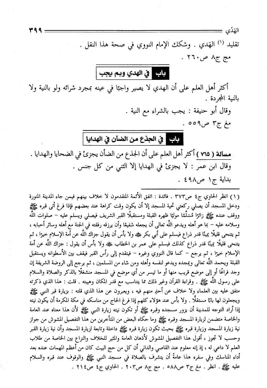 (¬1) انظر الحاوي ج 4 ص 373. فائدة: اتفق الأئمة المتقدمون لا خلاف بينهم فيمن جاء المدينة المنورة ودخل المسجد أن يصلي ركعتي تحية المسجد إلا أن يكون وقت كراهة عند بعضهم فإذا فرغ أتى قبره - صلى الله عليه وسلم - ووقف عنده - صلى الله عليه وسلم - زائرًا مُسَلِّمًا موليًا ظهره القبلة ومستقبلًا القبر الشريف فيصلي ويسلم عليه -صلوات الله وسلامه عليه- بما هو أهله ويدعو الله تعالى أن يجعله شفيعًا وأن يرزقه رفقته في الجنة مع أهله وسائر أحبابه، ثم يتنحى قليلًا يمينًا قدر ذراع فيسلم على أبي بكر - رضي الله عنه - ولا بأس أن يقول جزاك الله عن أمة الإِسلام خيرًا، ثم يتنحى قليلًا يمينًا قدر ذراع كذلك فيسلم على عمر بن الخطاب - رضي الله عنه - ولا بأس أن يقول: جزاك الله عن أمة الإِسلام خيرًا، ثم يرجع -كما قال النووى وغيره- فيتقدم إلى رأس القبر فيقف بين الأسطوانه ويستقبل القبلة ويحمد الله تعالى ويمجده ويدعو لنفسه وأهله ومن شاء من المسلمين، ثم يرجع إلى الروضة الشريفة إن وجد فراغًا أو إلى موضع قريب منها أو ما تيسر من أي موضع في المسجد منشغلًا بالذكر والصلاة والسلام على رسول الله - صلى الله عليه وسلم -. وقراءة القرآن وغير ذلك مما يتناسب مع قدر المكان وهيبته. قلت: هذا الذي ذكرته متفق عليه بين العلماء ولا خلاف عن أحدٍ منهم فيه، ويعبرون عن هذا الذي قلته: بزيارة قبر النبي - صلى الله عليه وسلم - ويجعلون لها بابَا مستقلًا. ولا بأس عند هؤلاء كلهم إذا فرغ الحاج من مناسكه في مكة المكرمة أن يكون نيته إذا أراد التوجه للمدينة أن يزور مسجده وقبره - صلى الله عليه وسلم - أو تكون نيته زيارة النبي - صلى الله عليه وسلم - لأن هذا معناه عند العامة والخاصة متضمن لزيارة المسجد وقبره - صلى الله عليه وسلم - وما حكاه البعض من المتأخرين من هذا التفصيل المشوش من جواز نية زيارة المسجد وزيارة قبره - صلى الله عليه وسلم - بحيث تكون زيارة قبره - صلى الله عليه وسلم - داخلة وتابعة لزيارة المسجد وأن نية زيارة القبر وحسب لا تجوز، أقول هذا التفصيل المشوش لأذهان العامة والمثير للخلاف والنزاع بين الخاصة من طلاب العلم لا داعي له، إذ إنه معلوم عند القاصي والداني أن كل من حج البيت كان من أعظم المهمات عنده بعد أداء المناسك وفي سفره هذا عامةً أن يتشرف بالصلاة في مسجد النبي - صلى الله عليه وسلم - والوقوف عند قبره والسلام عليه - صلى الله عليه وسلم -. انظر. مغ ج 3 ص 588. مج ج 8 ص 203. الحاوي ج 4 ص 214.