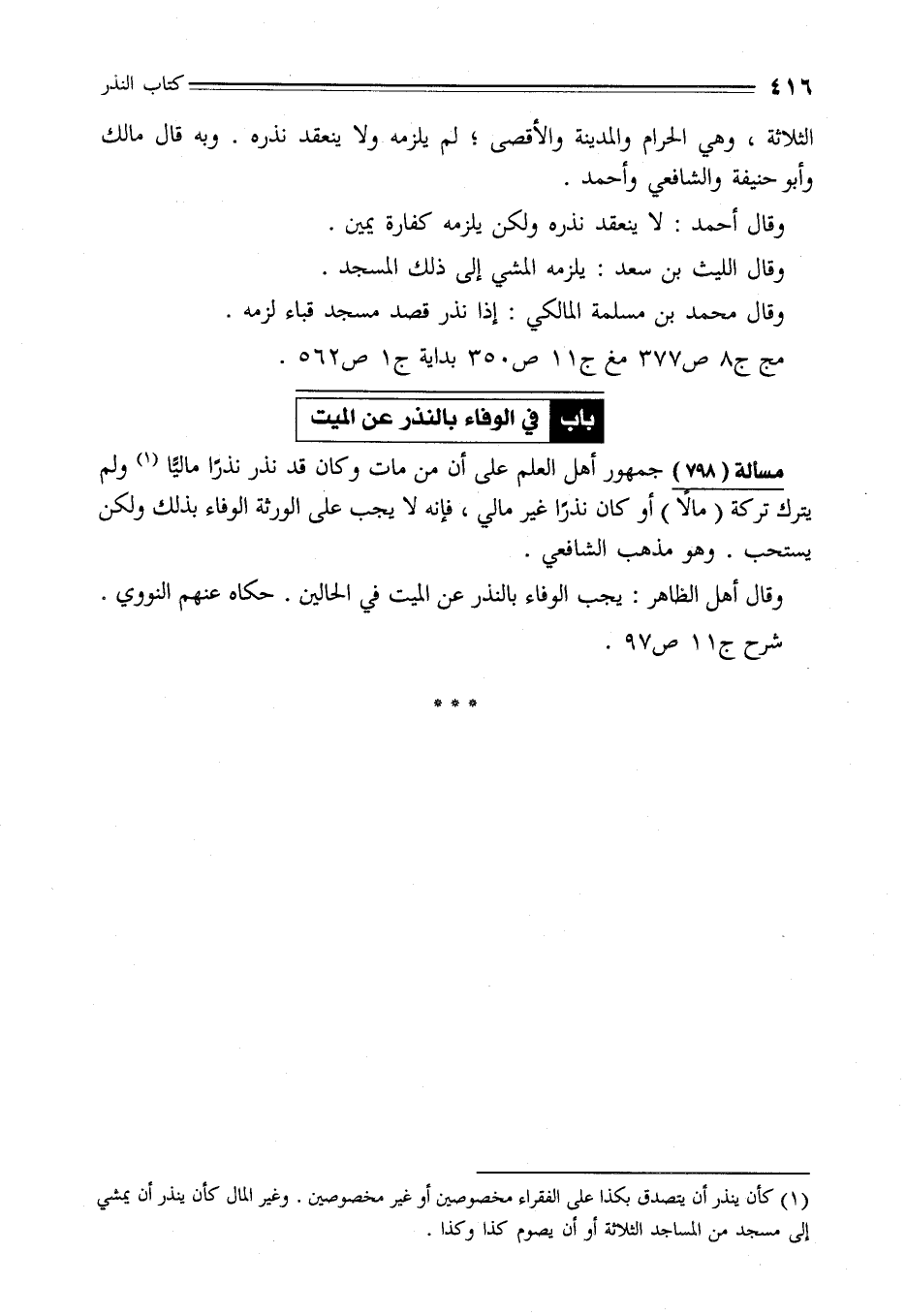 مسألة (798) جمهور أهل العلم على أن من مات وكان قد نذر نذرًا ماليًّا (¬1) ولم يترك تركة (مالًا) أو كان نذرًا غير مالي، فإنه لا يجب على الورثة الوفاء بذلك ولكن يستحب. وهو مذهب الشافعي.