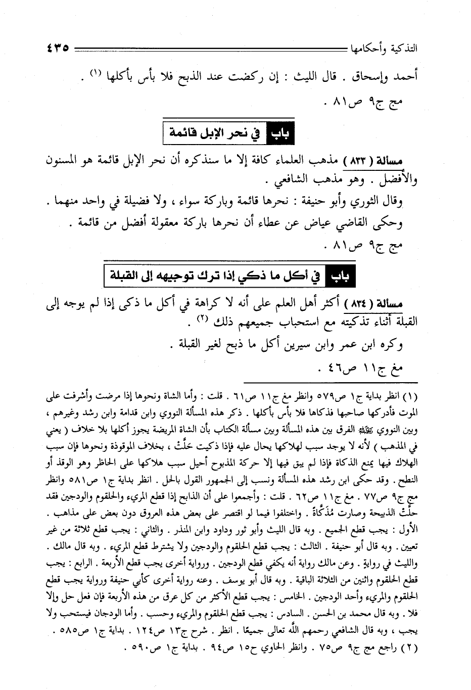 مسألة (833) مذهب العلماء كافة إلا ما سنذكره أن نحر الإبل قائمة هو المسنون والأفضل. وهو مذهب الشافعي.