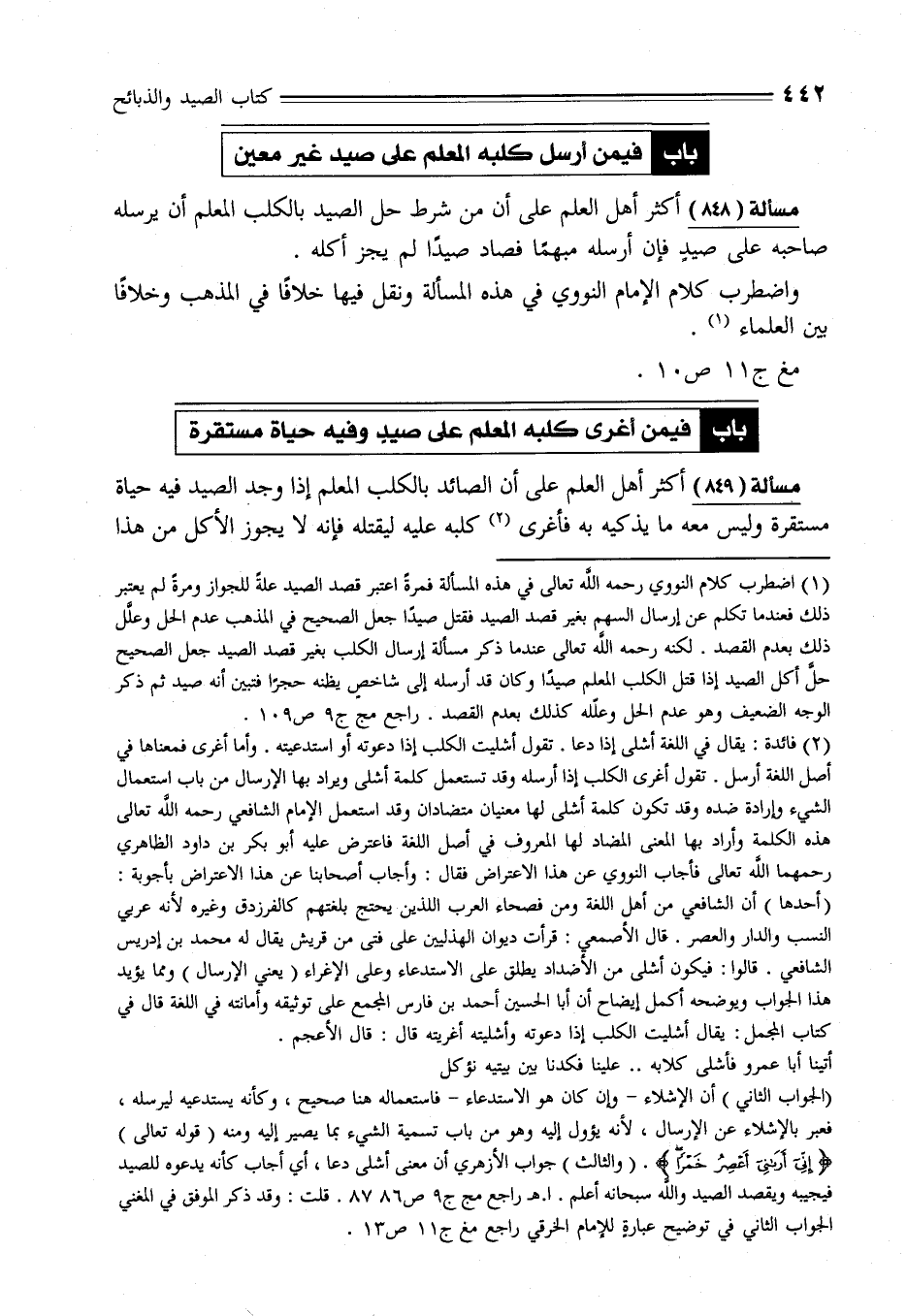 (¬2) فائدة: يقال في اللغة أشلى إذا دعا. تقول أشليت الكلب إذا دعوته أو استدعيته. وأما أغرى فمعناها في أصل اللغة أرسل. تقول أغرى الكلب إذا أرسله وقد تستعمل كلمة أشلى ويراد بها الإرسال من باب استعمال الشيء وإرادة ضده وقد تكون كلمة أشلى لها معنيان متضادان وقد استعمل الإِمام الشافعي -رحمه الله- تعالى هذه الكلمة وأراد بها المعنى المضاد لها المعروف في أصل اللغة فاعترض عليه أبو بكر بن داود الظاهري رحمهما الله تعالى فأجاب النوري عن هذا الاعتراض فقال: وأجاب أصحابنا عن هذا الاعتراض بأجوبة: (أحدها) أن الشافعي من أهل اللغة ومن فصحاء العرب اللذين يحتج بلغتهم كالفرزدق وغيره لأنه عربي النسب والدار والحصر. قال الأصمعي: قرأت ديوان الهذليين على فتى من قريش يقال له محمَّد بن إدريس الشافعي. قالوا: فيكون أشلى من الأضداد يطلق على الاستدعاء وعلى الإغراء (يعني الإرسال) ومما يؤيد هذا الجواب ويوضحه أكمل إيضاح أن أبا الحسين أحمد بن فارس المجمع على توثيقه وأمانته في اللغة قال في كتاب المجمل: يقال أشليت الكلب إذا دعوته وأشليته أغريته قال: قال الأعجم.