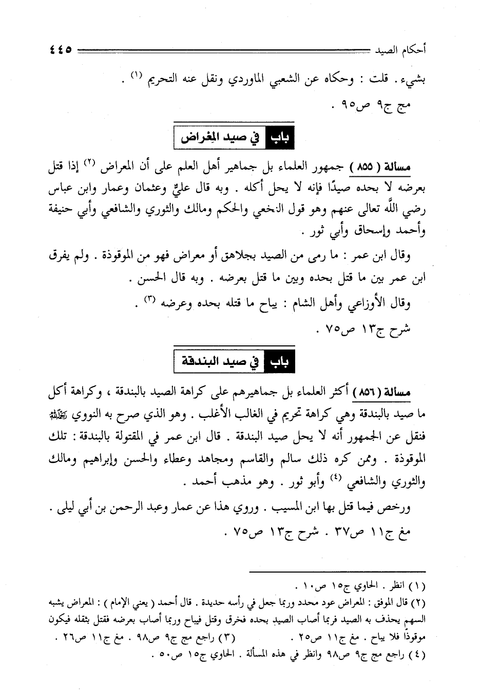 مسألة (856) أكثر العلماء بل جماهيرهم على كراهة الصيد بالبندقة، وكراهة أكل ما صيد بالبندقة وهي كراهة تحريم في الغالب الأغلب. وهو الذي صرح به النووي -رحمه الله- فنقل عن الجمهور أنه لا يحل صيد البندقة. قال ابن عمر في المقتولة بالبندقة: تلك الموقوذة. وممن كره ذلك سالم والقاسم ومجاهد وعطاء والحسن وإبراهيم ومالك والثوري والشافعي (¬4) وأبو ثور. وهو مذهب أحمد.