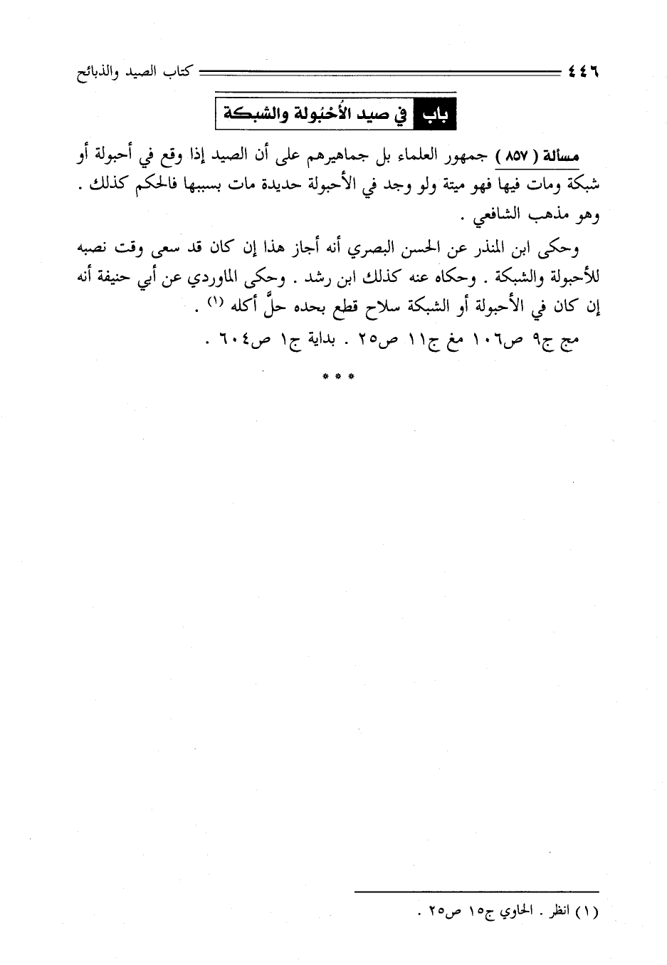 مسألة (857) جمهور العلماء بل جماهيرهم على أن الصيد إذا وقع في أحبولة أو شبكة ومات فيها فهو ميتة ولو وجد في الأحبولة حديدة مات بسببها فالحكم كذلك. وهو مذهب الشافعي.