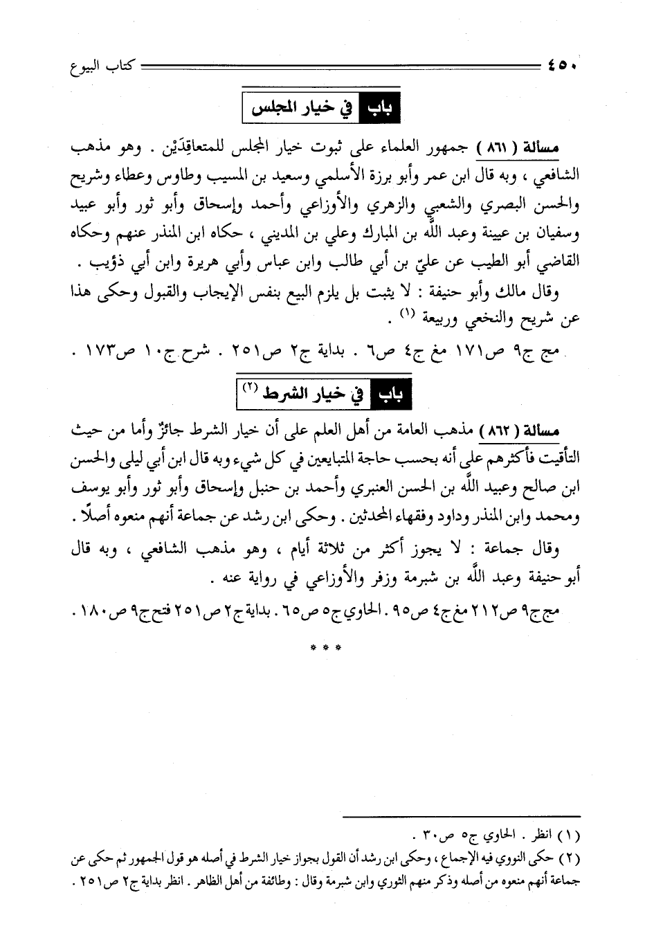 مسألة (861) جمهور العلماء على ثبوت خيار المجلس للمتعاقِدَيْن. وهو مذهب الشافعي، وبه قال ابن عمر وأبو برزة الأسلمي وسعيد بن المسيب وطاوس وعطاء وشريح والحسن البصري والشعبي والزهري والأوزاعي وأحمد وإسحاق وأبو ثور وأبو عبيد وسفيان بن عيينة وعبد الله بن المبارك وعلي بن المديني، حكاه ابن المنذر عنهم وحكاه القاضي أبو الطيب عن عليّ بن أبي طالب وابن عباس وأبي هريرة وابن أبي ذؤيب.