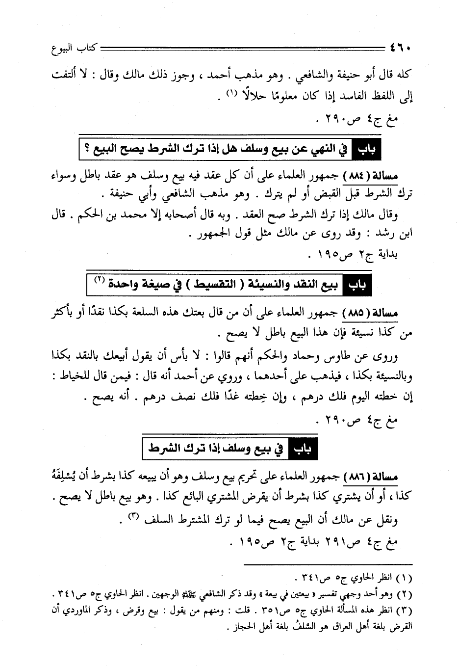(¬3) انظر هذه المسألة الحاوي ج 5 ص 351. قلت: ومنهم من يقول: بيع وقرض، وذكر الماوردي أن القرض بلغة أهل العراق هو السَّلفُ بلغة أهل الحجاز.