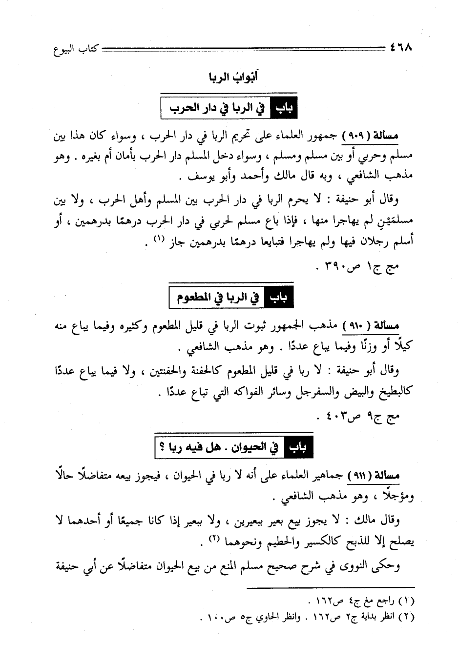 مسألة (911) جماهير العلماء على أنه لا ربا في الحيوان، فيجوز بيعه متفاضلًا حالًا ومؤجلًا، وهو مذهب الشافعي.