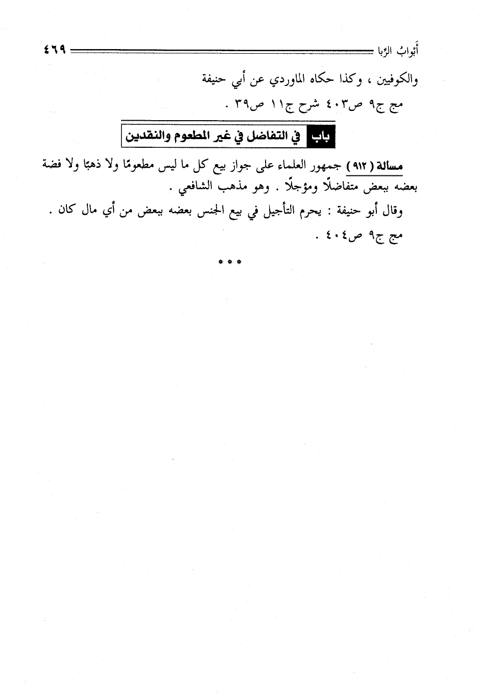 مسألة (912) جمهور العلماء على جواز بيع كل ما ليس مطعومًا ولا ذهبًا ولا فضة بعضه ببعض متفاضلًا ومؤجلًا. وهو مذهب الشافعي.
