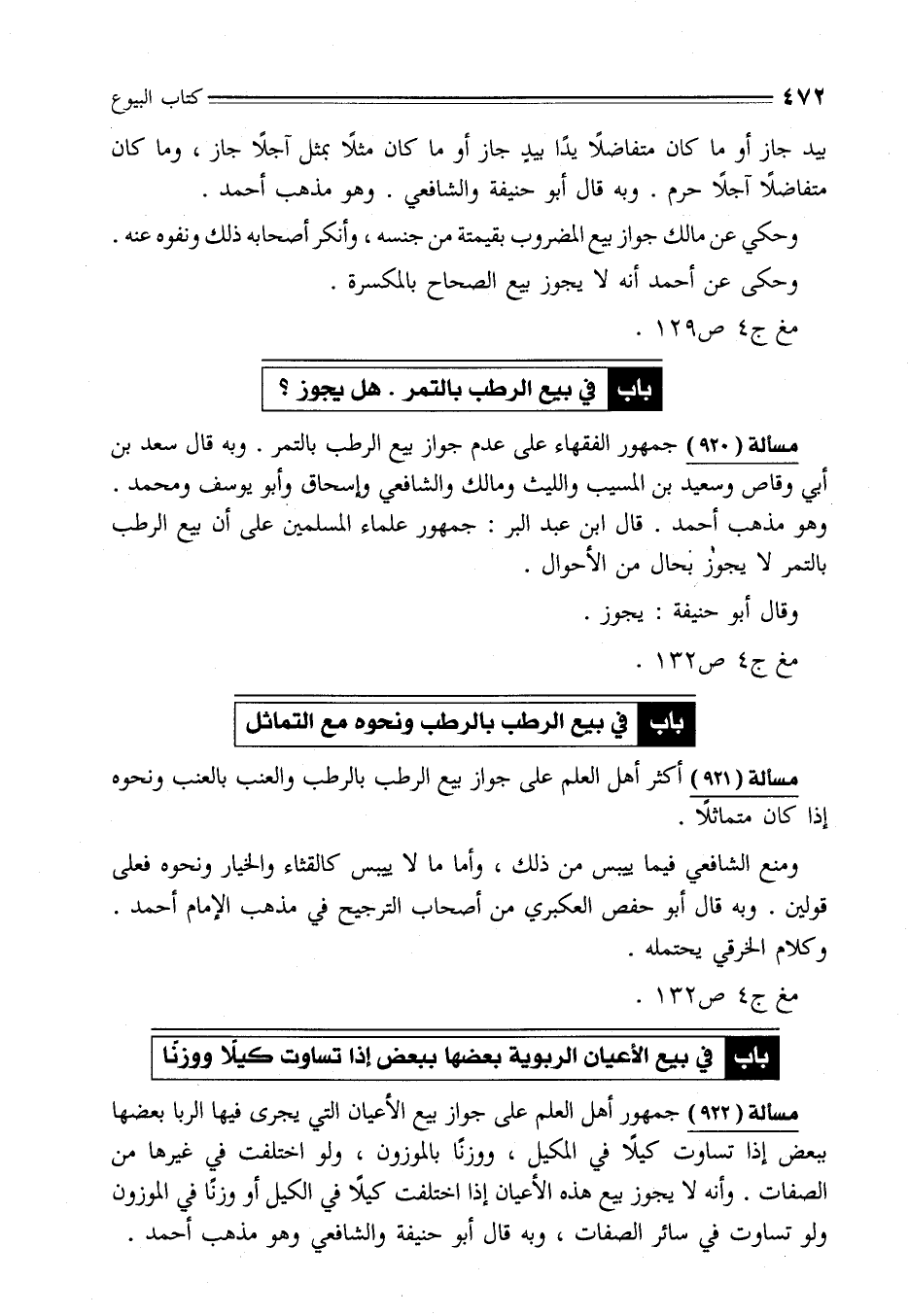مسألة (922) جمهور أهل العلم على جواز بيع الأعيان التي يجرى فيها الربا بعضها ببعض إذا تساوت كيلًا في المكيل، ووزنًا بالموزون، ولو اختلفت في غيرها من الصفات. وأنه لا يجوز بيع هذه الأعيان إذا اختلفت كيلًا في الكيل أو وزنًا في الوزون ولو تساوت في سائر الصفات، وبه قال أبو حنيفة والشافعي وهو مذهب أحمد.