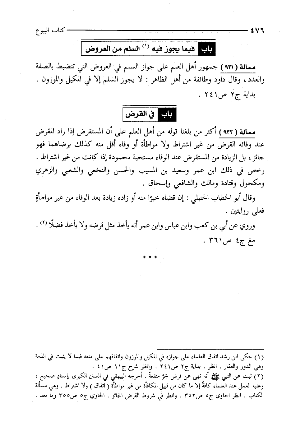 (¬2) ثبت عن النبي -صلى الله عليه وسلم- أنه نهى عن قرض جَرَّ منفعةً. أخرجه البيهقي في السنن الكبرى يإسنادٍ صحيح، وعليه العمل عند العلماء كافةً إلا ما كان من قبيل المكافأة من غير مواطأة (اتفاق) ولا اشتراط. وهي مسألة الكتاب. انظر الحاوي ج 5 ص 352. وانظر في شروط القرض الجائز. الحاوي ج 5 ص 355 وما بعد.