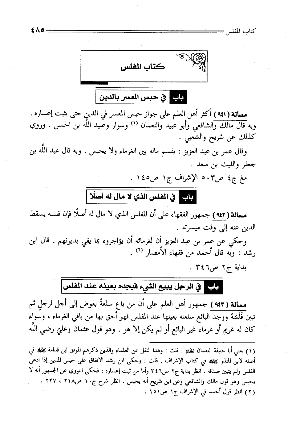 مسألة (942) جمهور الفقهاء على أن المفلس الذي لا مال له أصلًا فإن فلسه يسقط الدين عنه إلى وقت ميسرته.