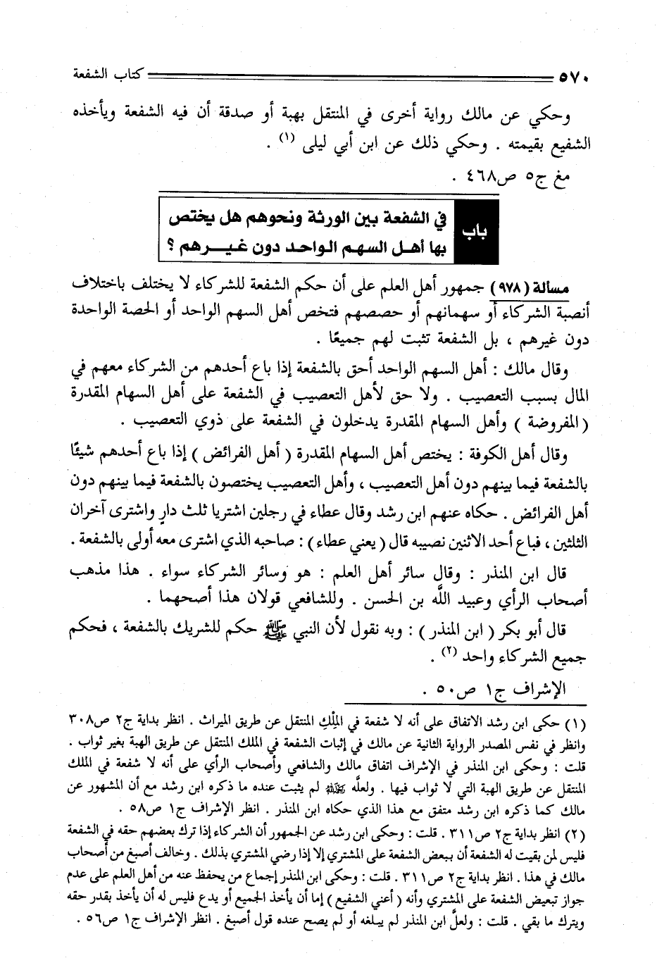 (¬1) حكى ابن رشد الاتفاق على أنه لا شفعة في المِلْكِ المنتقل عن طريق الميراث. انظر بداية ج 2 ص 308 وانظر في نفس المصدر الرواية الثانية عن مالك في إثبات الشفعة في الملك المنتقل عن طريق الهبة بغير ثواب. قلت: وحكى ابن المنذر في الإشراف اتفاق مالك والشافعي وأصحاب الرأي على أنه لا شفعة في الملك المنتقل عن طريق الهبة التي لا ثواب فيها. ولعلَّه -رحمه الله- لم يثبت عنده ما ذكره ابن رشد مع أن المشهور عن مالك كما ذكره ابن رشد متفق مع هذا الذي حكاه ابن المنذر. انظر الإشراف ج 1 ص 58.