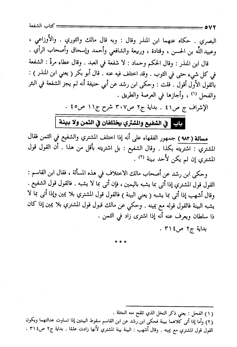 وحكى ابن رشد عن أصحاب مالك الاختلاف في هذه المسألة، فقال ابن القاسم: القول قول المشتري إذا أتى بما يشبه باليمين، فإن أتى بما لا يشبه. فالقول قول الشفيع. وقال أشهب إذا أتى بما يشبه (يعني البينة) فالقول قول المشتري بلا يمين وإذا أتى بما لا يشبه البينة فالقول قوله مع يمينه. وحكي عن مالك قبول قول المشتري بلا يمين إذا كان ذا سلطان ويعرف عنه أنه إذا اشترى زاد في الثمن.