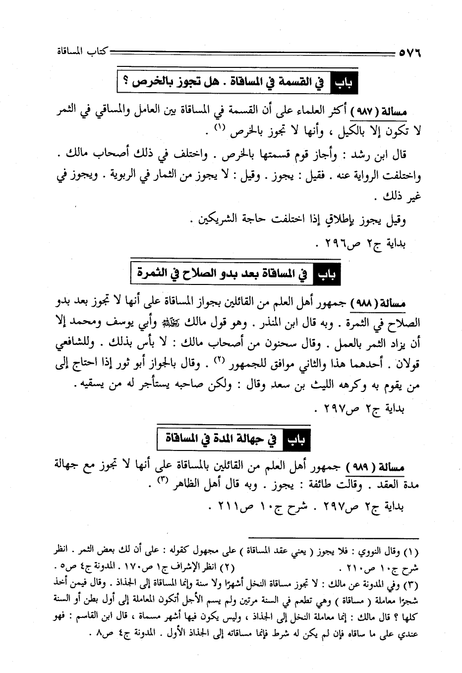مسألة (989) جمهور أهل العلم من القائلين بالمساقاة على أنها لا تجوز مع جهالة مدة العقد. وقالت طائفة: يجوز. وبه قال أهل الظاهر (¬3).