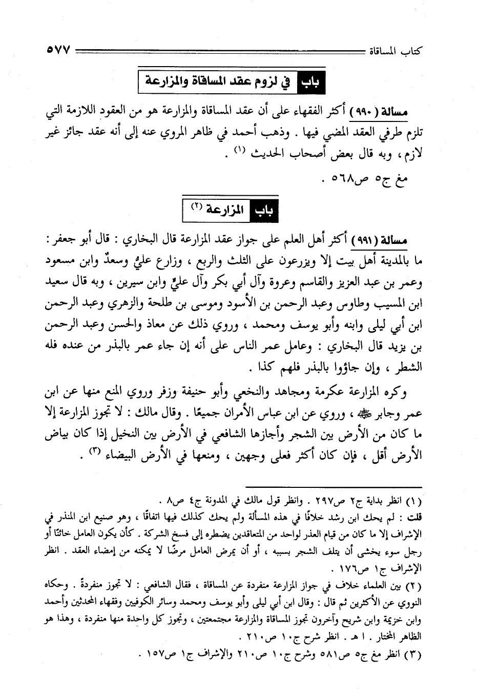 مسألة (990) أكثر الفقهاء على أن عقد المساقاة والمزارعة هو من العقود اللازمة التي تلزم طرفي العقد المضي فيها. وذهب أحمد في ظاهر المروي عنه إلى أنه عقد جائز غير لازم، وبه قال بعض أصحاب الحديث (¬1).