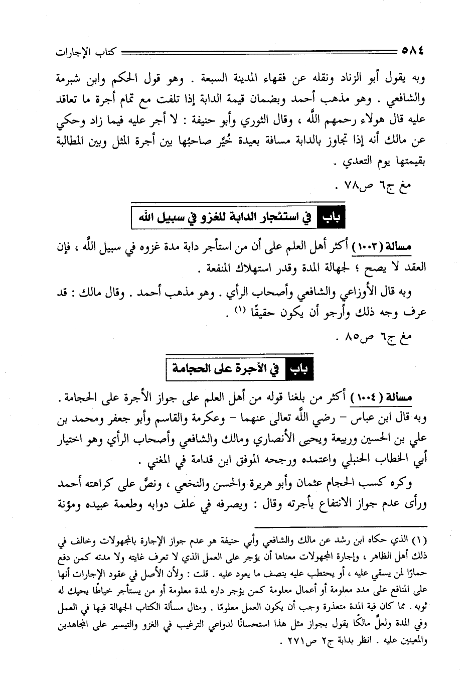 (¬1) الذي حكاه ابن رشد عن مالك والشافعي وأبي حنيفة هو عدم جواز الإجارة بالمجهولات وخالف في ذلك أهل الظاهر، وإجارة المجهولات معناها أن يؤجر على العمل الذي لا تعرف غايته ولا مدته كمن دفع حمارًا لمن يسقي عليه، أو يحتطب عليه بنصف ما يعود عليه. قلت: ولأن الأصل في عقود الإجارات أنها على المنافع على مدد معلومة أو أعمال معلومة كمن يؤجر دره لمدة معلومة أو من يستأجر خياطًا يحيك له ثوبه. مما كان فية المدة متعذرة وجب أن يكون العمل معلومًا. ومثال مسألة الكتاب الجهالة فيها في العمل وفي المدة ولعلَّ مالكًا يقول بجواز مثل هذا استحسانًا لدواعي الترغيب في الغزو والتيسير على المجاهدين والمعينين عليه. انظر بدابة ج 2 ص 271.