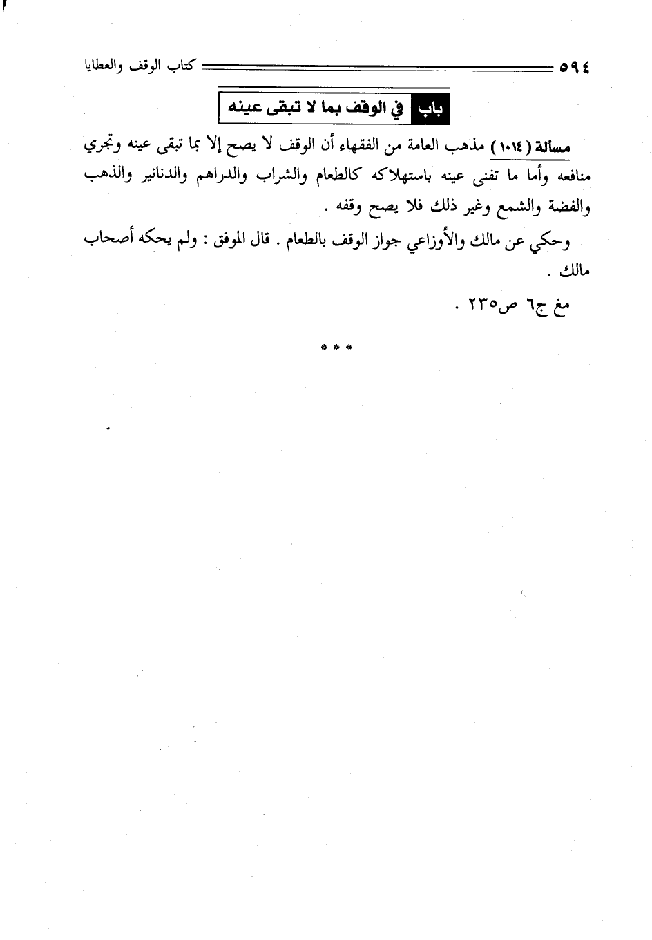 مسألة (1014) مذهب العامة من الفقهاء أن الوقف لا يصح إلا بما تبقى عينه وتجري منافعه وأما ما تفنى عينه باستهلاكه كالطعام والشراب والدراهم والدنانير والذهب والفضة والشمع وغير ذلك فلا يصح وقفه.