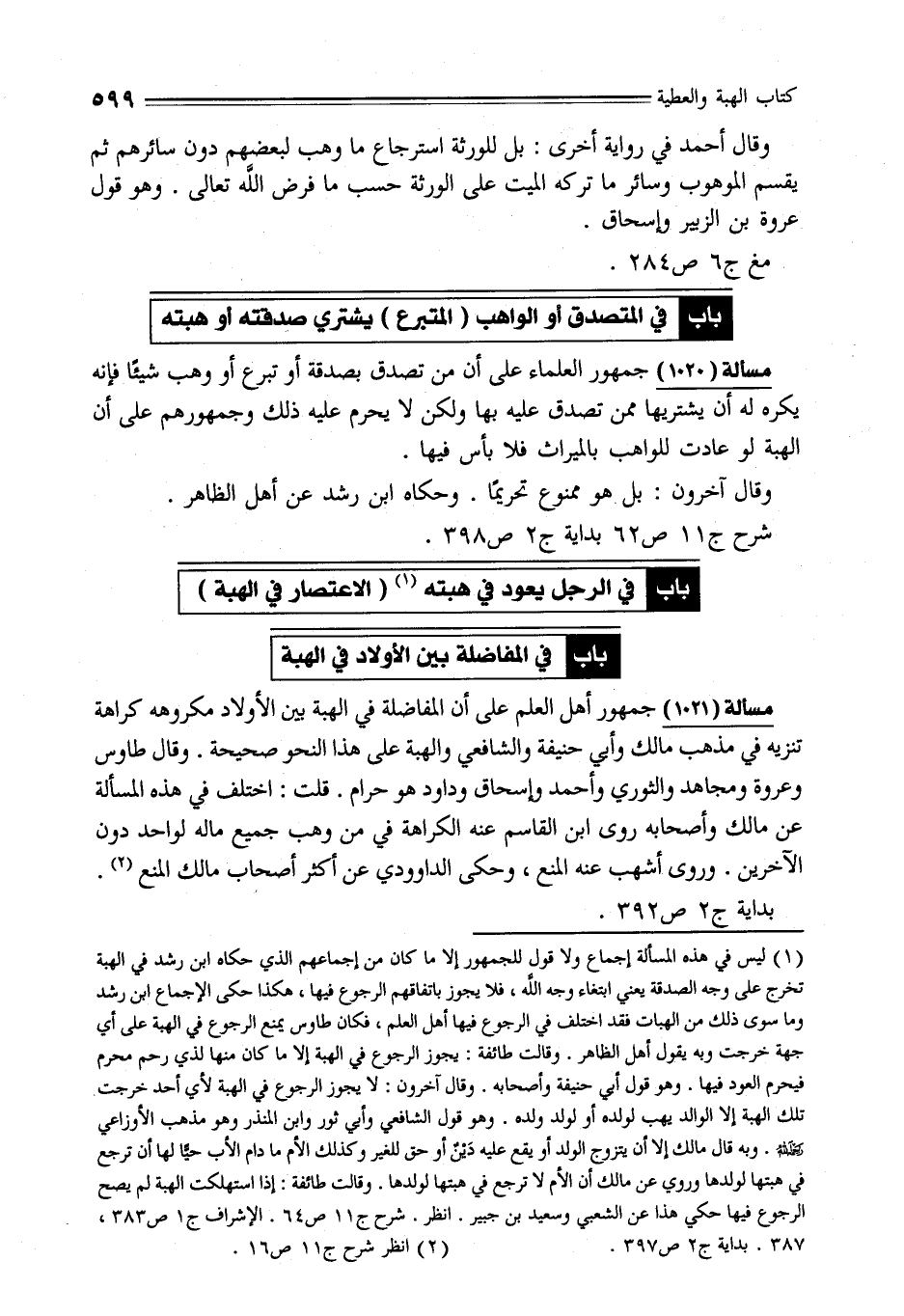 (¬1) ليس في هذه المسألة إجماع ولا قول للجمهور إلا ما كان من إجماعهم الذي حكاه ابن رشد في الهبة تخرج على وجه الصدقة يعني ابتغاء وجه الله، فلا يجوز باتفاقهم الرجوع فيها، هكذا حكى الإجماع ابن رشد وما سوى ذلك من الهبات فقد اختلف في الرجوع فيها أهل العلم، فكان طاوس يمنع الرجوع في الهبة على أي جهة خرجت وبه يقول أهل الظاهر. وقالت طائفة: يجوز الرجوع في الهبة إلا ما كان منها لذي رحم محرم فيحرم العود فيها. وهو قول أبي حنيفة وأصحابه. وقال آخرون: لا يجوز الرجوع في الهبة لأي أحد خرجت تلك الهبة إلا الوالد يهب لولده أو لولد ولده. وهو قول الشافعي وأبي ثور وابن المنذر وهو مذهب الأوزاعي -رحمه الله-. وبه قال مالك إلا أن يتزوج الولد أو يقع عليه دَيْنٌ أو حق للغير وكذلك الأم ما دام الأب حيًا لها أن ترجع في هبتها لولدها وروي عن مالك أن الأم لا ترجع في هبتها لولدها. وقالت طائفة: إذا استهلكت الهبة لم يصح الرجوع فيها حكي هذا عن الشعبي وسعيد بن جبير. انظر. شرح ج 11 ص 64. الإشراف ج 1 ص 383، 387. بداية ج 2 ص 397.