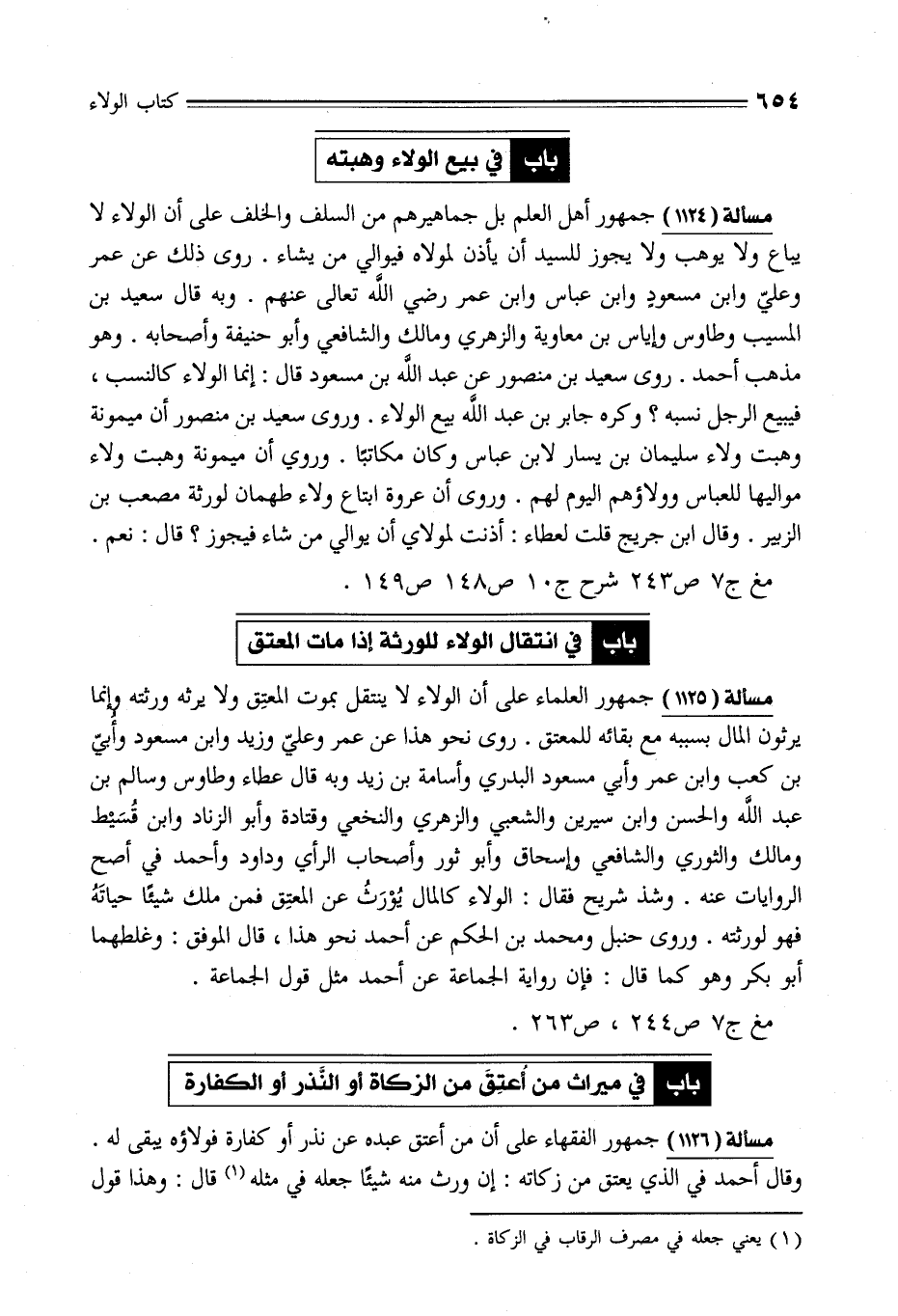 مسألة (1126) جمهور الفقهاء على أن من أعتق عبده عن نذر أو كفارة فولاؤه يبقى له. وقال أحمد في الذي يعتق من زكاته: إن ورث منه شيئًا جعله في مثله (¬1) قال: وهذا قول