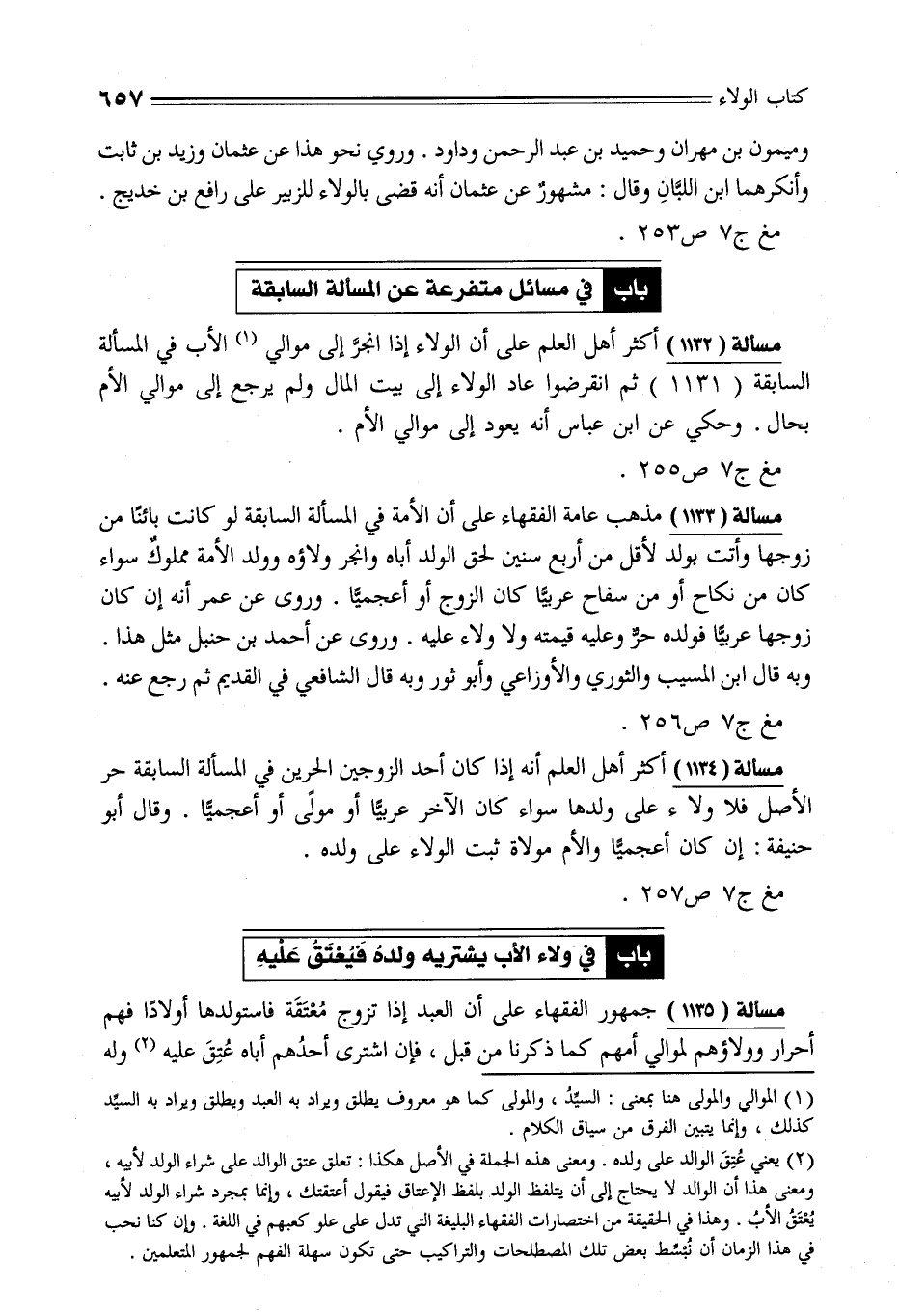 مسألة (1135) جمهور الفقهاء على أن العبد إذا تزوج مُعْتَقَة فاستولدها أولادًا فهم أحرار وولاؤهم لموالي أمهم كما ذكرنا من قبل، فإن اشترى أحدُهم أباه عُتِقَ عليه (¬2) وله
