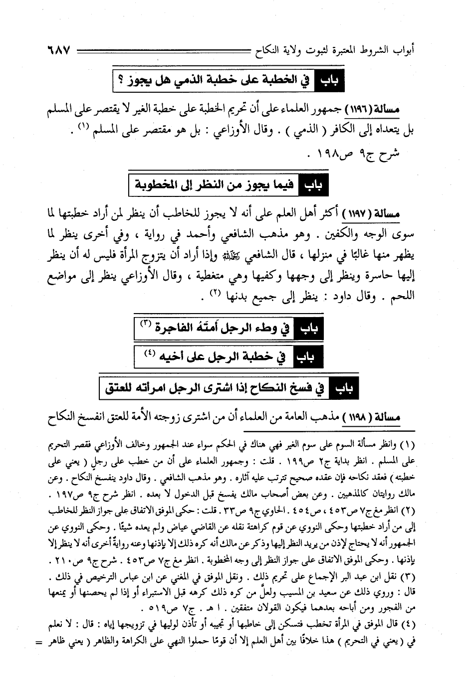 (¬1) وانظر مسألة السوم على سوم الغير فهي هناك في الحكم سواء عند الجمهور وخالف الأوزاعي فقصر التحريم على المسلم. انظر بداية ج 2 ص 199. قلت: وجمهور العلماء على أن من خطب على رجلٍ (يعني على خطبته) فعقد نكاحه فإن عقده صحيح تترتب عليه آثاره. وهو مذهب الشافعي. وقال داود ينفسخ النكاح. وعن مالك روايتان كالمذهبين. وعن بعض أصحاب مالك يفسخ قبل الدخول لا بعده. انظر شرح ج 9 ص 197.