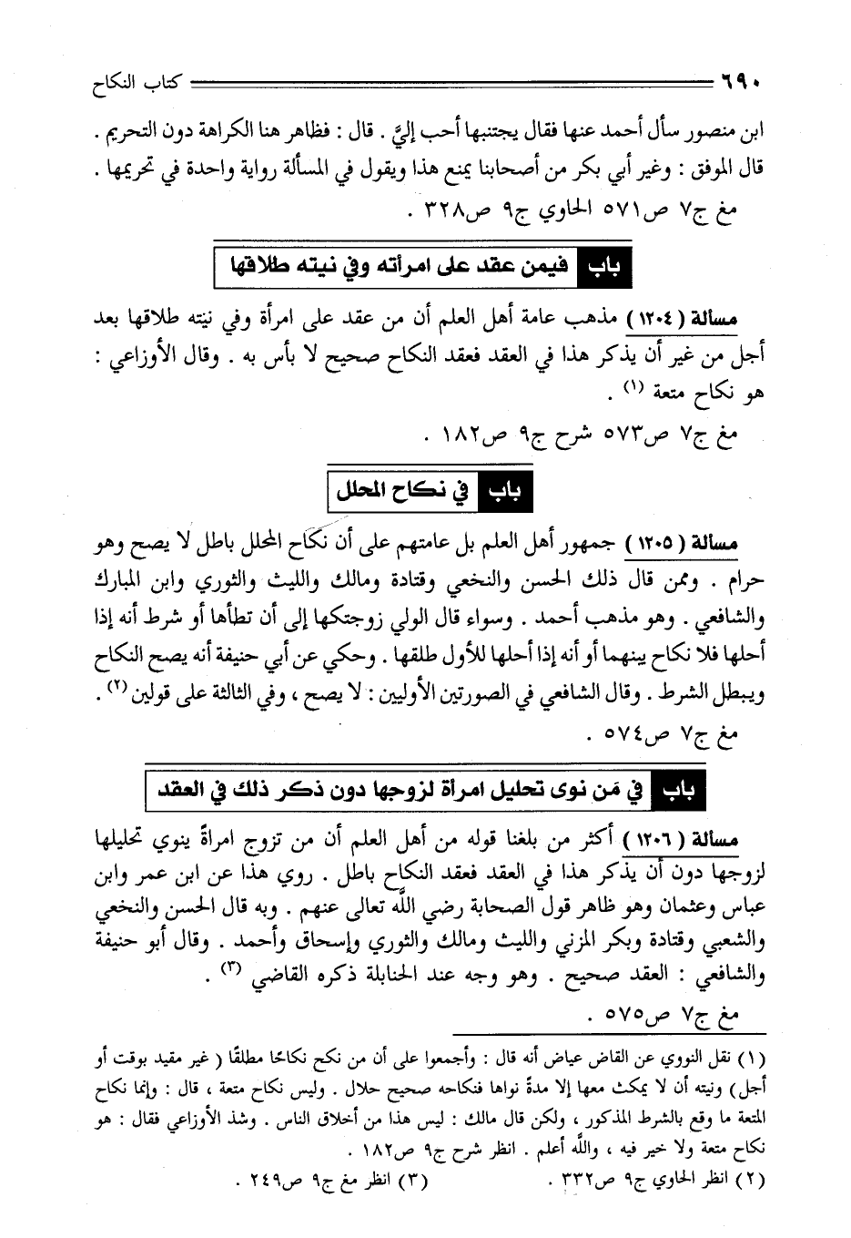 مسألة (1206) أكثر من بلغنا قوله من أهل العلم أن من تزوج امراةً ينوي تحليلها لزوجها دون أن يذكر هذا في العقد فعقد النكاح باطل. روي هذا عن ابن عمر وابن عباس وعثمان وهو ظاهر قول الصحابة رضي الله تعالى عنهم. وبه قال الحسن والنخعي والشعبي وقتادة وبكر المزني والليث ومالك والثوري وإسحاق وأحمد. وقال أبو حنيفة والشافعي: العقد صحيح. وهو وجه عند الحنابلة ذكره القاضي (¬3).