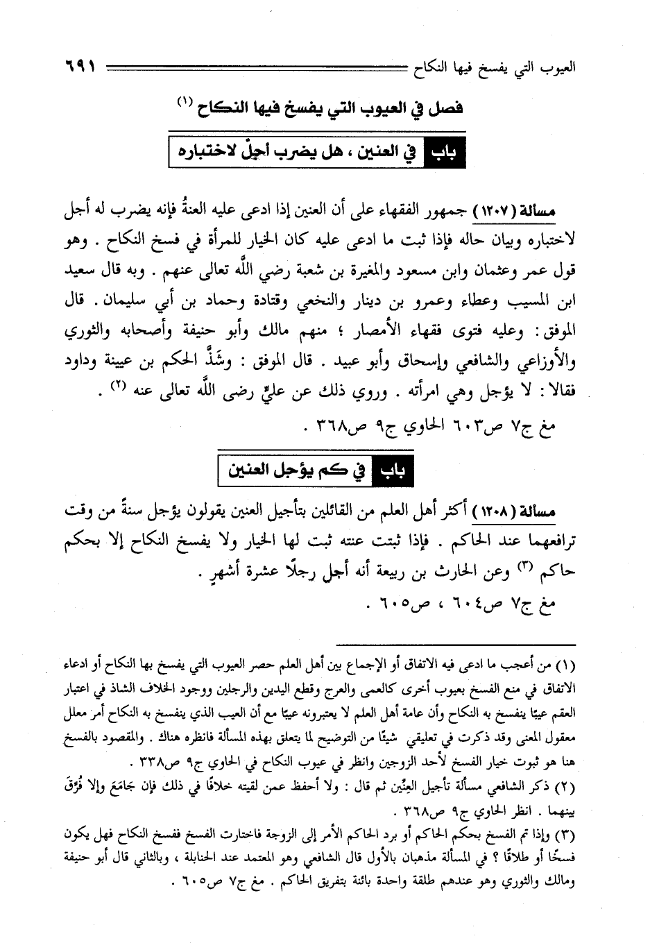 (¬1) من أعجب ما ادعى فيه الاتفاق أو الإجماع بين أهل العلم حصر العيوب للتي يفسخ بها النكاح أو ادعاء الاتفاق في منع الفسخ بعيوب أخرى كالعمى والعرج وقطع اليدين والرجلين ووجود الخلاف الشاذ في اعتبار العقم عيبًا ينفسخ به النكاح وأن عامة أهل العلم لا يعتبرونه عيبًا مع أن العيب الذي ينفسخ به النكاح أمر معلل معقول المعنى وقد ذكرت في تعليقي شيئًا من التوضيح لما يتعلق بهذه المسألة فانظره هناك. والمقصود بالفسخ هنا هو ثبوت خيار الفسخ لأحد الزوجين وانظر في عيوب النكاح في الحاوي ج 9 ص 338.