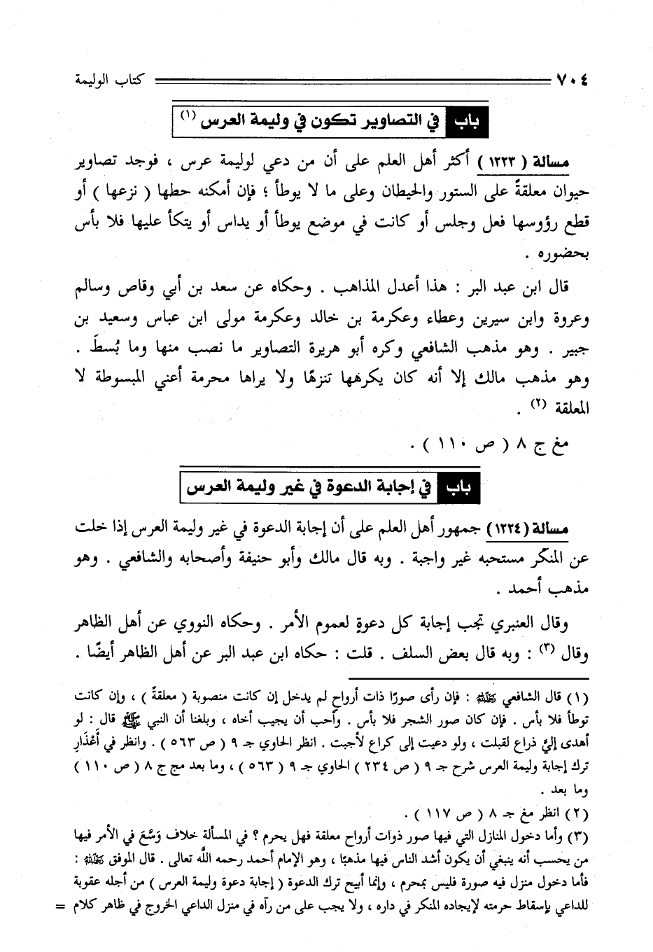 مسألة (1223) أكثر أهل العلم على أن من دعي لوليمة عرس، فوجد تصاوير حيوان معلقةً على الستور والحيطان وعلى ما لا يوطأ؛ فإن أمكنه حطها (نزعها) أو قطع رؤوسها فعل وجلس أو كانت في موضع يوطأ أو يداس أو يتكأ عليها فلا بأس بحضوره.