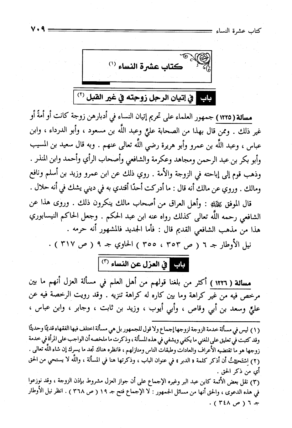 (¬3) نقل بعض الأئمة كابن عبد البر وغيره الإجماع على أن جواز العزل مشروط بإذن الزوجة، وقد نوزعوا في هذه الدعوى، والحق أنها من مسائل الجمهور: لا الإجماع فتح جـ 19 (ص 368). انظر نيل الأوطار جـ 6 (ص 348).