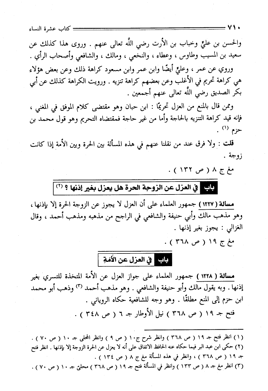 (¬2) حكى ابن عبد البر فيما حكاه عنه الحافظ الاتفاق على أنه لا يعزل عن الحرة الزوجة إلا بإذنها. انظر فتح جـ 19 (ص 368)، وانظر في هذه المسألة مغ ج 8 (ص 134).