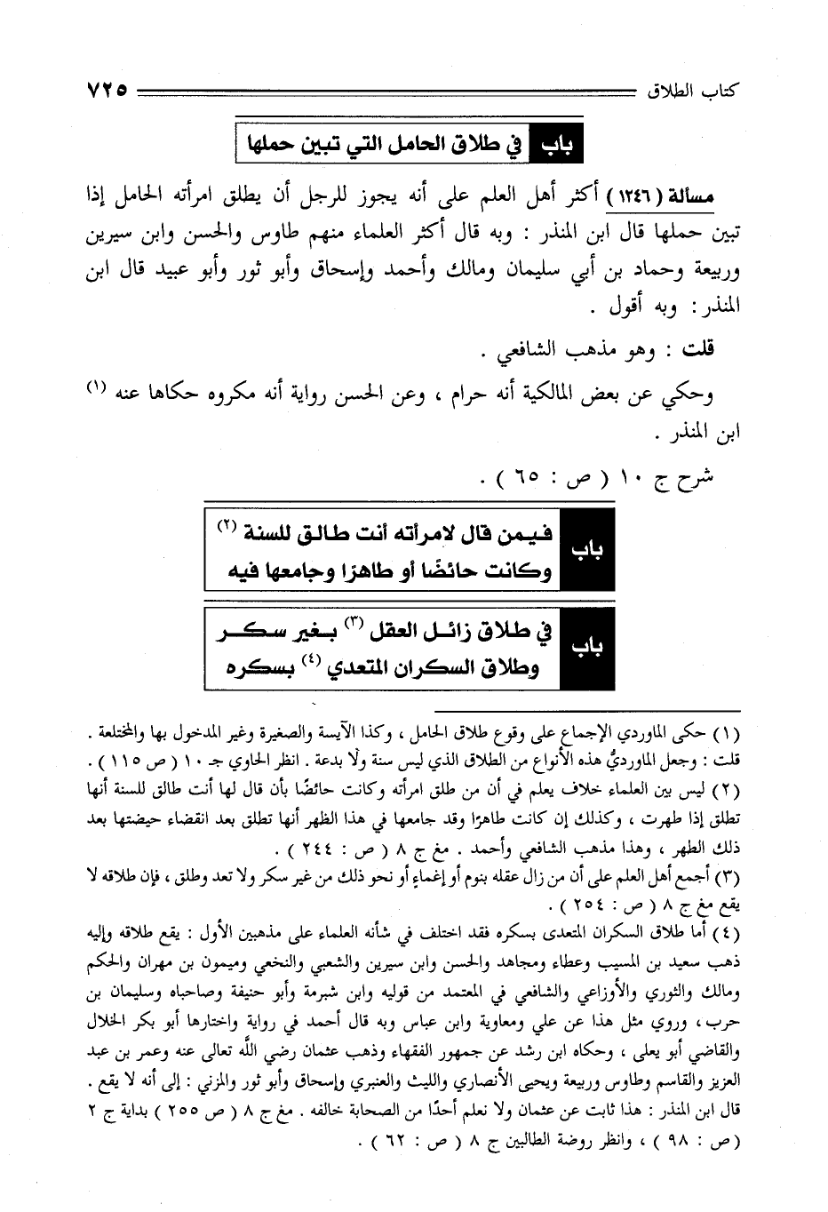 مسألة (1246) أكثر أهل العلم على أنه يجوز للرجل أن يطلق امرأته الحامل إذا تبين حملها قال ابن المنذر: وبه قال أكثر العلماء منهم طاوس والحسن وابن سيرين وربيعة وحماد بن أبي سليمان ومالك وأحمد وإسحاق وأبو ثور وأبو عبيد قال ابن المنذر: وبه أقول.