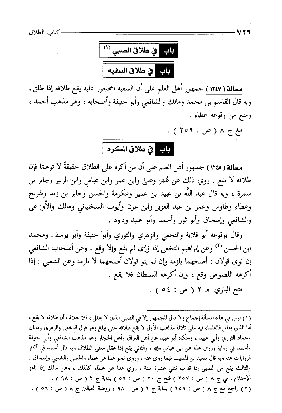 مسألة (1247) جمهور أهل العلم على أن السفيه المحجور عليه يقع طلاقه إذا طلق، وبه قال القاسم بن محمَّد ومالك والشافعي وأبو حنيفة وأصحابه، وهو مذهب أحمد، ومنع من وقوعه عطاء.