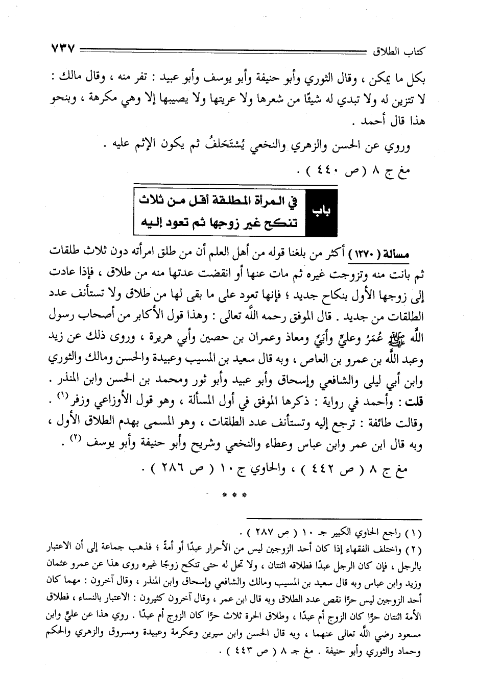 مسألة (1270) أكثر من بلغنا قوله من أهل العلم أن من طلق امرأته دون ثلاث طلقات ثم بانت منه وتزوجت غيره ثم مات عنها أو انقضت عدتها منه من طلاق، فإذا عادت إلى زوجها الأول بنكاح جديد؛ فإنها تعود على ما بقى لها من طلاق ولا تستأنف عدد الطلقات من جديد. قال الموفق -رحمه الله- تعالى: وهذا قول الأكابر من أصحاب رسول الله - صلى الله عليه وسلم - عُمَرُ وعليٍّ وأبَيِّ ومعاذ وعمران بن حصين وأبي هريرة, وروى ذلك عن زيد وعبد الله بن عمرو بن العاص، وبه قال سعيد بن المسيب وعبيدة والحسن ومالك والثوري وابن أبي ليلى والشافعي وإسحاق وأبو عبيد وأبو ثور ومحمد بن الحسن وابن المنذر.