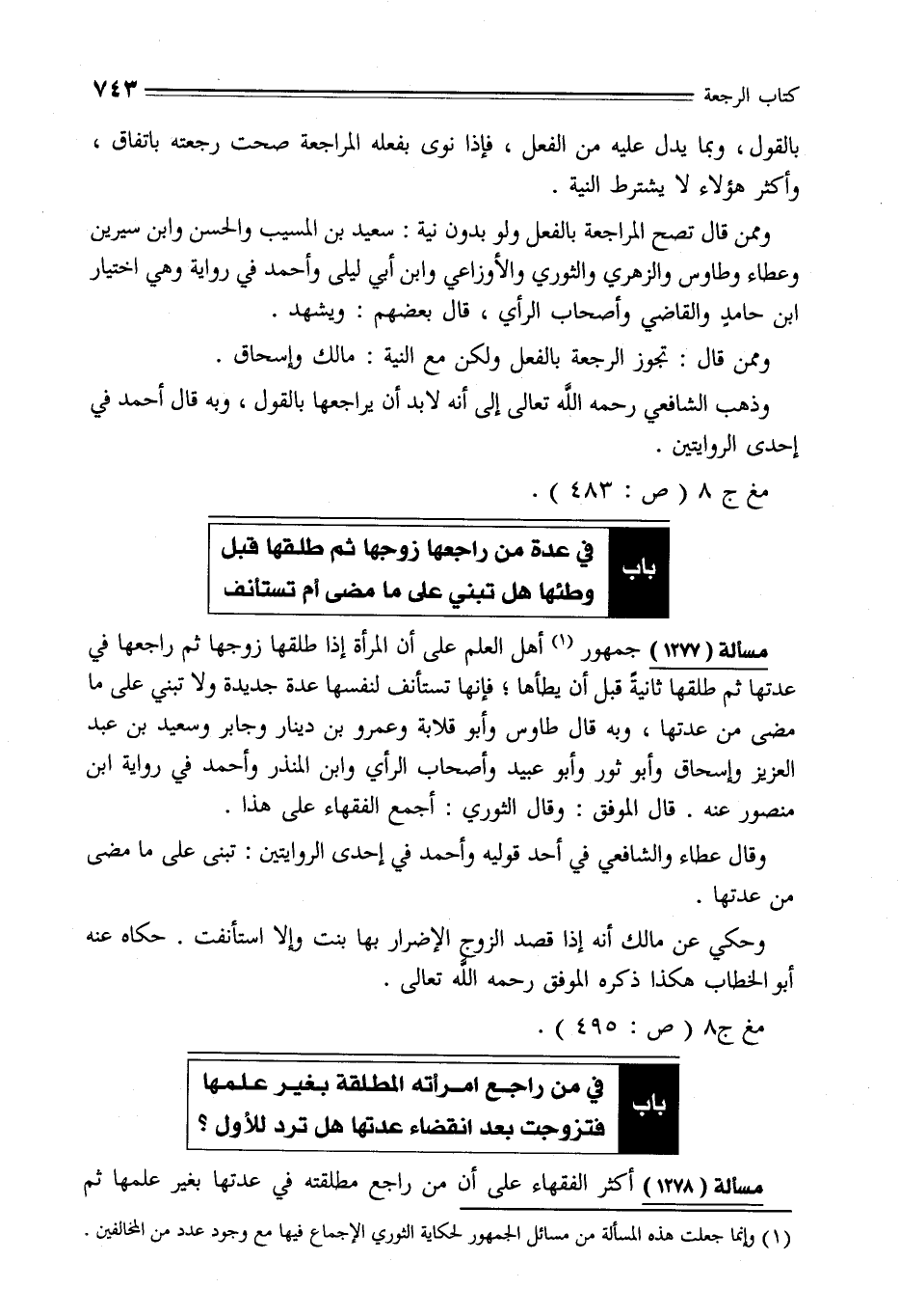 وممن قال تصح المراجعة بالفعل ولو بدون نية: سعيد بن المسيب والحسن وابن سيرين وعطاء وطاوس والزهري والثوري والأوزاعي وابن أبي ليلى وأحمد في رواية وهي اختيار ابن حامدٍ والقاضي وأصحاب الرأي، قال بعضهم: ويشهد.