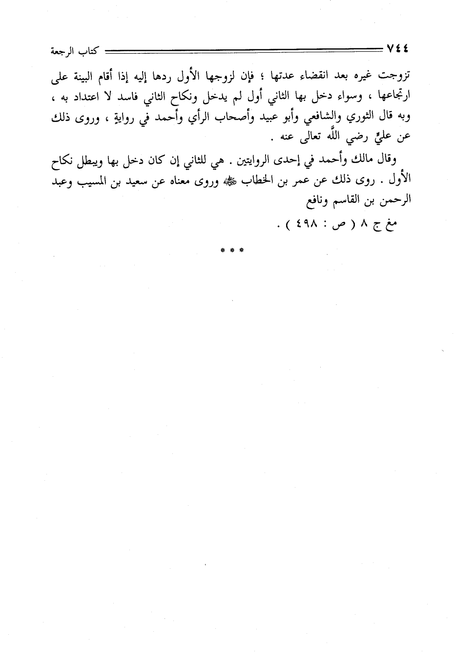 تزوجت غيره بعد انقضاء عدتها؛ فإن لزوجها الأول ردها إليه إذا أقام البينة على ارتجاعها، وسواء دخل بها الثاني أول لم يدخل ونكاح الثاني فاسد لا اعتداد به، وبه قال الثوري والشافعي وأبو عبيد وأصحاب الرأي وأحمد في روايةٍ، وروى ذلك عن عليٍّ رضي الله تعالى عنه.