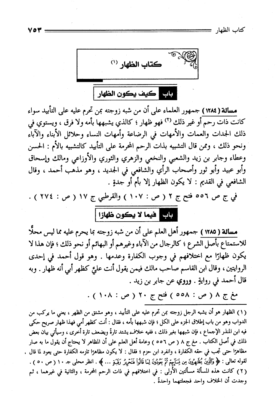 (¬1) الظهار هو أن يشبه الرجل زوجته بمن تحرم عليه على التأييد، وهو مشتق من الظهر، يعني ما يركب من الدواب وهو من باب إطلاق الجزء على الكل؛ فإن شبهها بأمه، فقال: أنت كظهر أمي فهذا ظهار صريح حكى فيه ابن المنذر الإجماع، فإن شبهها بغير ذلك، ففيه خلاف يشتد تارةً ويضعف تارة أخرى، وسيأتي بيان بعض ذلك في أصل الكتاب، مغ ج 8 (ص 556) وعامة أهل العلم على أن المظاهر هو لا يحتاج أن يقول ما به صار مظاهرًا حتى تجب في حقه الكفارة، وانفرد ابن حزم؛ فقال: لا يكون مظاهرًا تلزمه الكفارة حتى يعود لما قال لقوله تعالى: {وَالَّذِينَ يُظَاهِرُونَ مِنْ نِسَائِهِمْ ثُمَّ يَعُودُونَ لِمَا قَالُوا فَتَحْرِيرُ رَقَبَةٍ ...}. انظر محلى جـ 10 (ص 50).