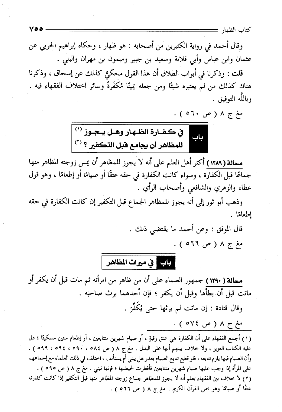 مسألة (1290) جمهور العلماء على أن من ظاهر من امرأته ثم مات قبل أن يكفر أو ماتت قبل أن يطأها وقبل أن يكفر؛ فإن أحدهما يرث صاحبه.
