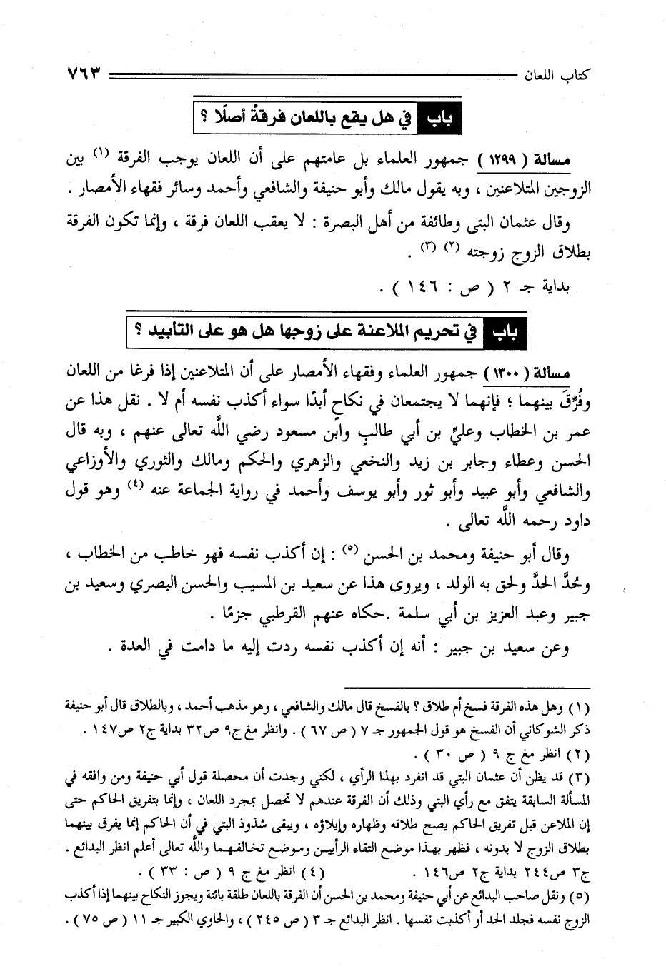 مسألة (1299) جمهور العلماء بل عامتهم على أن اللعان يوجب الفرقة (¬1) بين الزوجين المتلاعنين، وبه يقول مالك وأبو حنيفة والشافعي وأحمد وسائر فقهاء الأمصار.