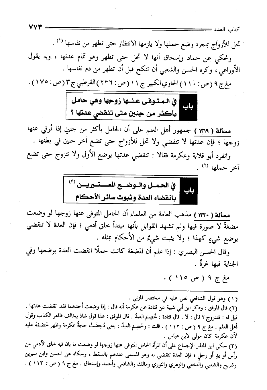 مسألة (1319) جمهور أهل العلم على أن الحامل بأكثر من جنينٍ إذا تُوفي عنها زوجها؛ فإن عدتها لا تنقضي ولا تحل للأزواج حتى تضع آخر جنين في بطنها.
