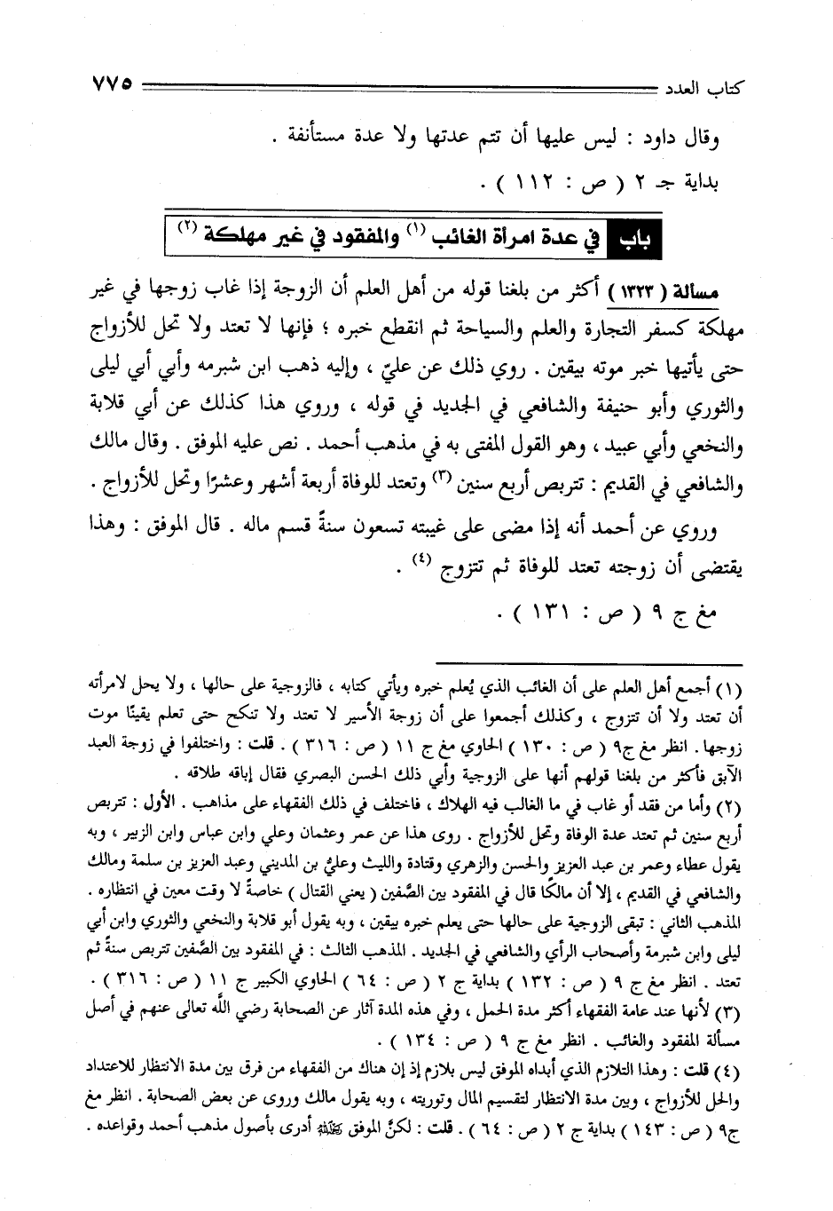 (¬4) قلت: وهذا التلازم الذي أبداه الموفق ليس بلازم إذ إن هناك من الفقهاء من فرق بين مدة الانتظار للاعتداد والحل للأزواج، ويين مدة الانتظار لتقسيم المال وتوريثه، وبه يقول مالك وروى عن بعض الصحابة. انظر مغ ج 9 (ص: 143) بداية ج 2 (ص: 64). قلت: لكنَّ الموفق -رحمه الله-: أدرى بأصول مذهب أحمد وقواعده.