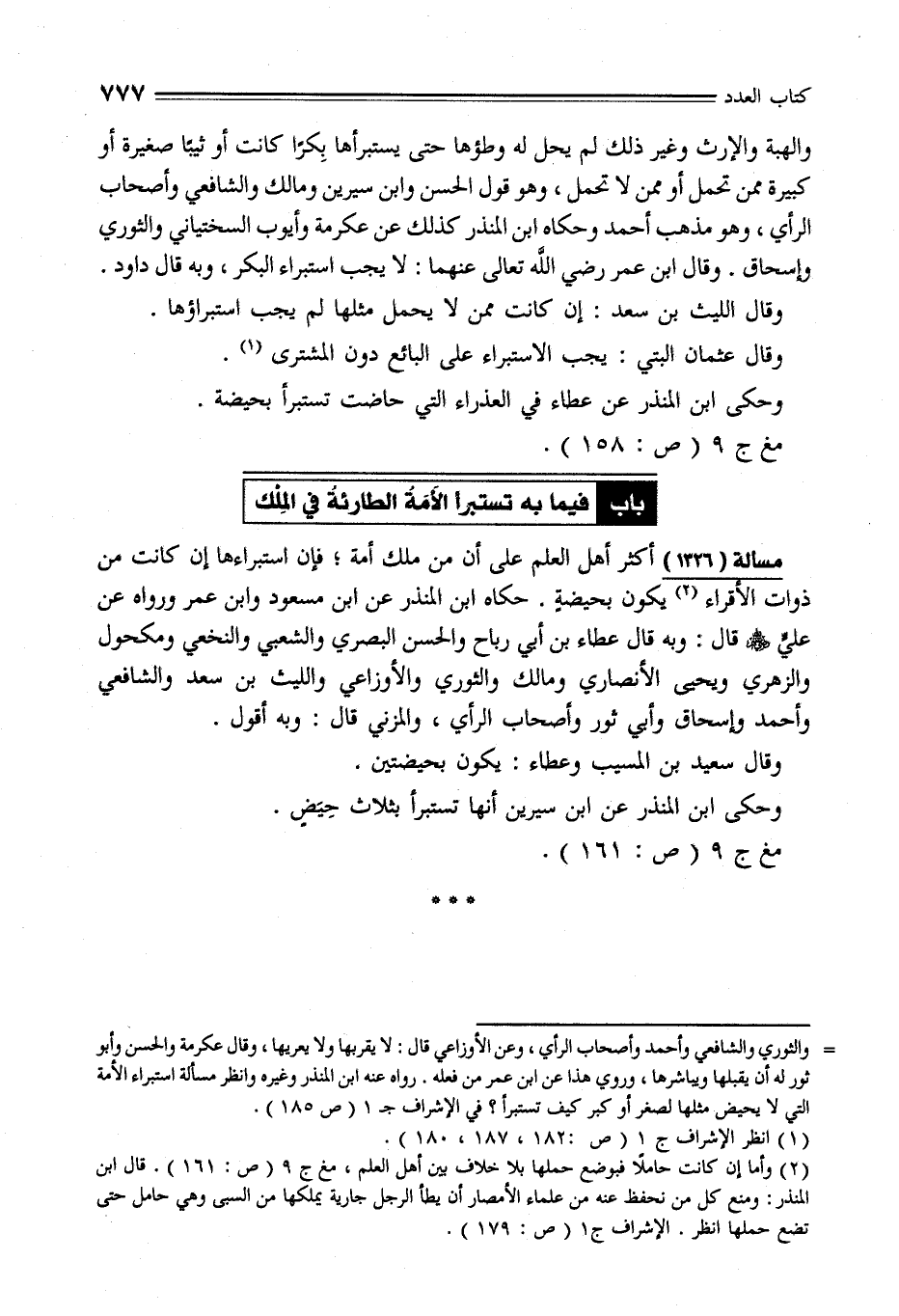 مسألة (1326) أكثر أهل العلم على أن من ملك أمة؛ فإن أستبراءها إن كانت من ذوات الأقراء (¬2) يكون بحيضةٍ. حكاه ابن المنذر عن ابن مسعود وابن عمر ورواه عن عليٍّ - رضي الله عنهم - قال: وبه قال عطاء بن أبي رباح والحسن البصري والشعبي والنخعي ومكحول والزهري ويحيى الأنصاري ومالك والثوري والأوزاعي والليث بن سعد والشافعي وأحمد وإسحاق وأبي ثور وأصحاب الرأي، والمزني قال: وبه أقول.