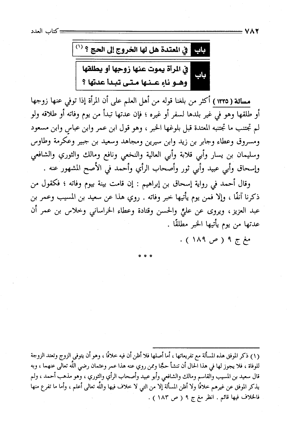 (¬1) ذكر الموفق هذه المسألة مع تفريعاتها، أما أصلها فلا أظن أن فيه خلافًا، وهو أن يتوفى الزوج وتعتد الزوجة للوفاة، فلا يجوز لها في هذا الحال أن تنشأ حجًّا وممن روي عنه هذا عمر وعثمان رضي اللَّه تعالى عنهما، وبه قال سعيد بن المسيب والقاسم ومالك والشافعي وأبو عبيد وأصحاب الرأي والثوري، وهو مذهب أحمد، ولم يذكر الموفق عن غيرهم خلافًا ولا أظن المسألة إلا من التي لا خلاف فيها واللَّه تعالى أعلم، وأما ما تفرع منها فالخلاف فيها قائم. انظر مغ ج 9 (ص 183).